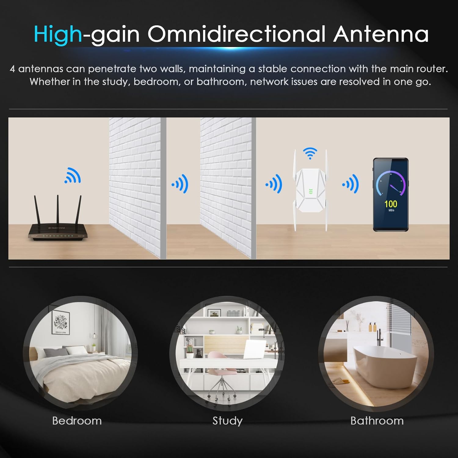 Wide Coverage & Wall Penetration: The WiFi extender signal booster expands your network range, penetrating walls and eliminating dead zones — perfect for large homes and multi-floor setups.