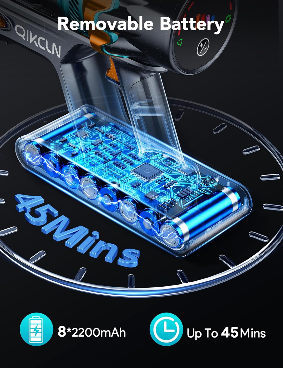 【Upgraded Removable 8 cells Battery】This stick vacuum cleaner comes with a removable lithium-ion battery that provides 18 minutes of max suction or up to 50 minutes on low mode. Super long battery life supports you to clean the whole house