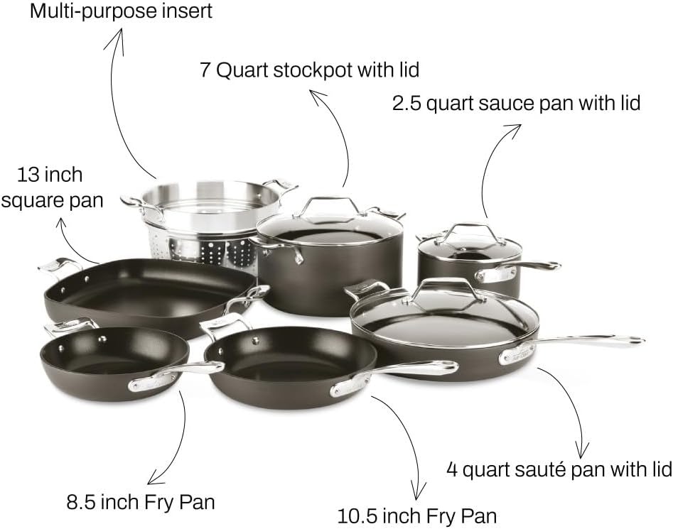 Experience professional cooking with this cookware set that includes 8.5 inch & 10.5 inch Fry Pans, 4 Quart covered Sauté pan, 2.5 Quart covered Sauce Pan, 7 Quart covered Stockpot and Multi-Purpose insert, 13 inch Square Pan, and two bonus silicone trivets.