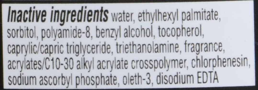 Active Ingredients: Avobenzone 3%, Homosalate 10%, Octisalate 5%, Octocrylene 10% (sunscreen); Inactive Ingredients: Water, ethylhexyl palmitate, sorbitol, polyamide-8, benzyl alcohol, tocopherol, caprylic/capric triglyceride, triethanolamine, fragrance, acrylates/C10-30 alkyl acrylate crosspolymer, chlorphenesin, sodium ascorbyl phosphate, oleth-3, disodium EDTA