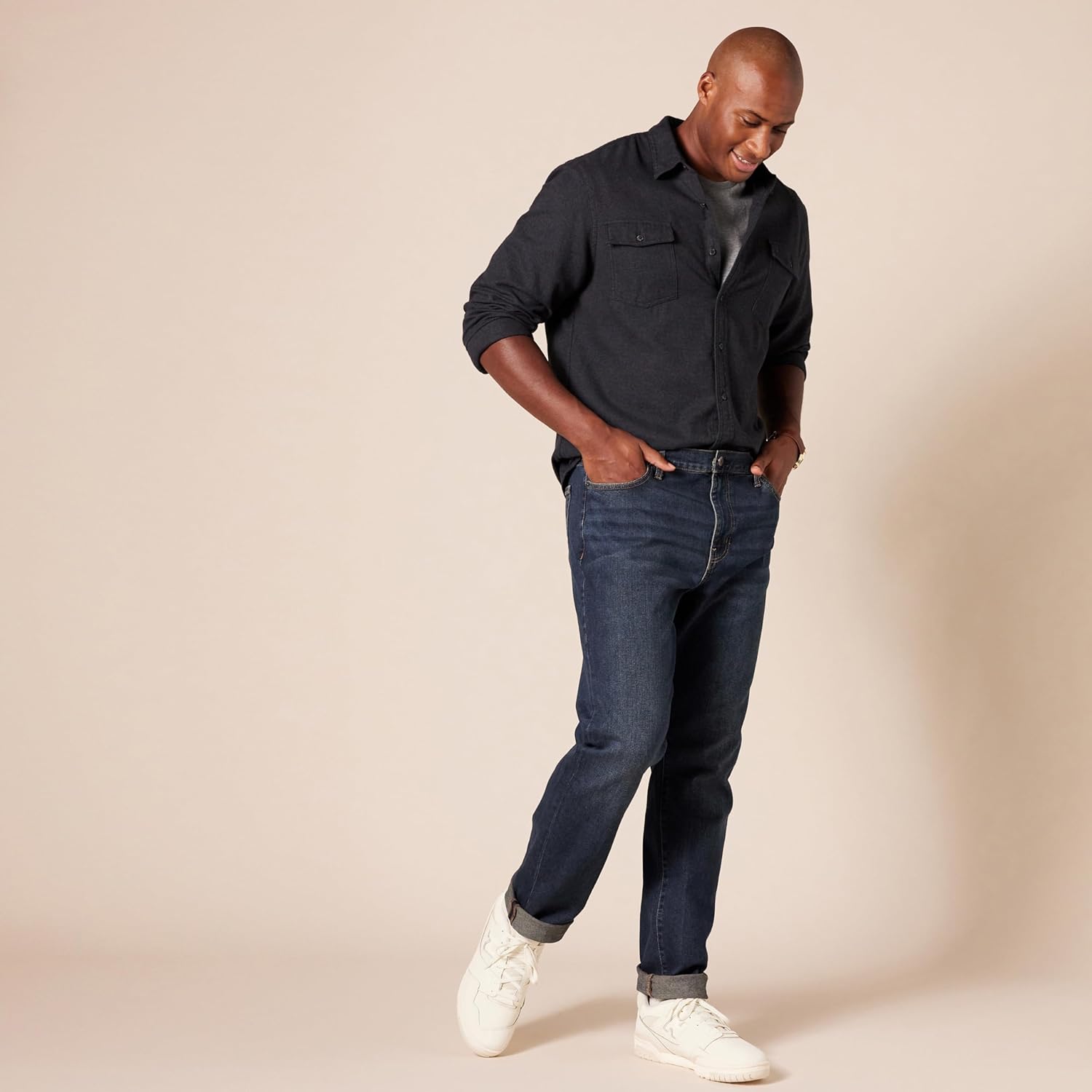 Crafted from mid-weight cotton denim, these blue jeans for men incorporate a light-stretch fabric, providing all-day comfort. The classic design includes five pockets, a zippered fly, metal button closure, bartack reinforcements, and rivets at the front hand pockets. With a variety of denim washes and solid colors, these Amazon Essentials men’s slim jeans offer men’s clothing that combines affordability and high standards.