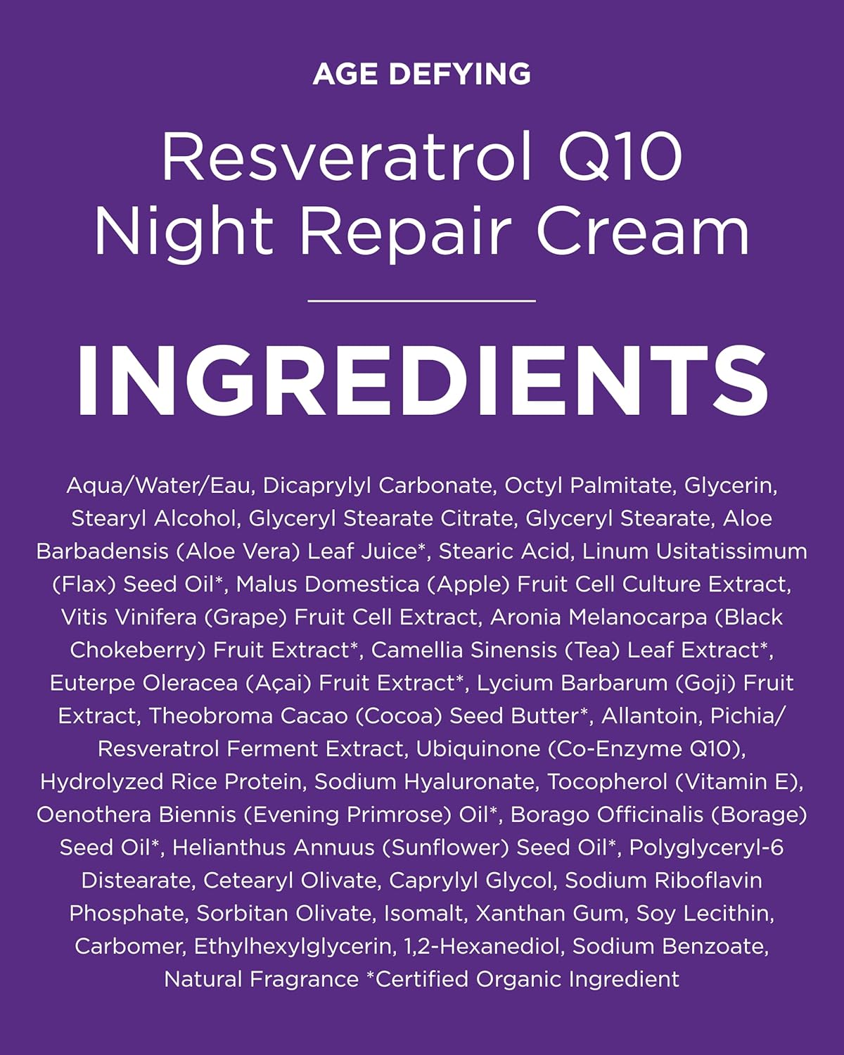 Fruit stem cell complex and resveratrol CoQ10, super antioxidants, boost dermal vitality as goji glycopeptides uplift tone and texture overnight for velvety soft skin with the appearance of fewer fine lines and wrinkles and a rejuvenated complexion. Aloe Barbadensis Leaf Juice*, Purified Water (Aqua), Dicaprylyl Carbonate, Stearyl Alcohol, Linum Usitatissimum (Flax) Seed Oil*, Cetyl Alcohol, Ethylhexyl Palmitate, Glyceryl Stearate, Fruit Stem Cells (Malus Domestica, Solar Vitis) and BioActive 8 Berry Complex*, Theobroma Cacao (Cocoa) Seed Butter*, Allantoin, Resveratrol, Ubiquinone (CoQ10), Hydrolyzed Rice Protein, Sodium Hyaluronate, Lycium Barbarum (Goji) Fruit Extract, Fagus Sylvatica (Beech) Bud Extract, Tocopherol, Magnesium Ascorbyl Phosphate (Vitamin C), Borago Officinalis (Borage) Seed Oil*, Persea Gratissima (Avocado) Fruit Oil*, Rosa Canina (Rosehip) Fruit Oil*, Oenothera Biennis (Evening Primrose) Oil*, Olive Squalane, Camellia Sinensis (White Tea) Leaf Extract*†, Aspalathus Linearis (Rooibos) Extract*†, Hibiscus Sabdariffa Flower Extract*†, Riboflavin, Phenethyl Alcohol, Ethylhexylglycerin, Vanilla Isolates, Symphytum Officinale (Comfrey) Extract* *Certified Organic Ingredients †Fair Trade Ingredients
