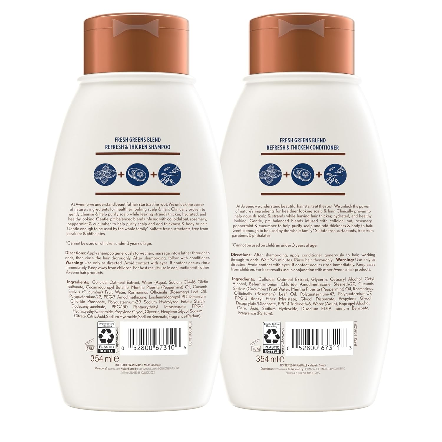 Aveeno Fresh Greens Shampoo and Conditioner for women and men is a sulfate free shampoo and conditioner set, to deliver volumizing shampoo benefits, clarifying shampoo action, and visibly thicker support for fine or thin hair. This daily hair care duo is infused with oat as the first ingredient, plus rosemary, peppermint, and cucumber, helping to nourish the scalp and add light moisture without weighing hair down. The clarifying shampoo formula gently removes buildup, making it ideal for those seeking body and fullness. Formulated without sulfates, parabens, and dyes, this set features a fresh fragrance and is suitable for daily use and all hair types. To use, apply shampoo to wet hair, lather, and rinse thoroughly, then follow with conditioner for added nourishment and manageability. Each pack contains two 12 fl oz bottles, providing a complete hair care solution for those looking to enhance volume, maintain healthy, balanced hair and safe for color treated hair. This shampoo and conditioner are ideal for men or women with fine or thinning hair, offering a gentle, effective formula that supports scalp health and leaves hair feeling moisturized. Choose Aveeno Fresh Greens for a sulfate free shampoo and conditioner set that helps give fine or thin hair a fuller look, supports healthy hair from root to tip, and delivers the trusted care of Aveeno’s farm-fresh heritage in every wash.
