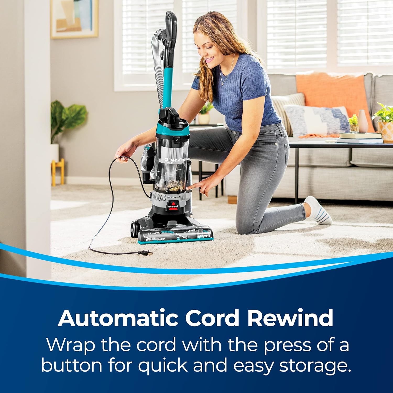 AUTOMATIC CORD REWIND. Wrap the cord easily with the press of a button.