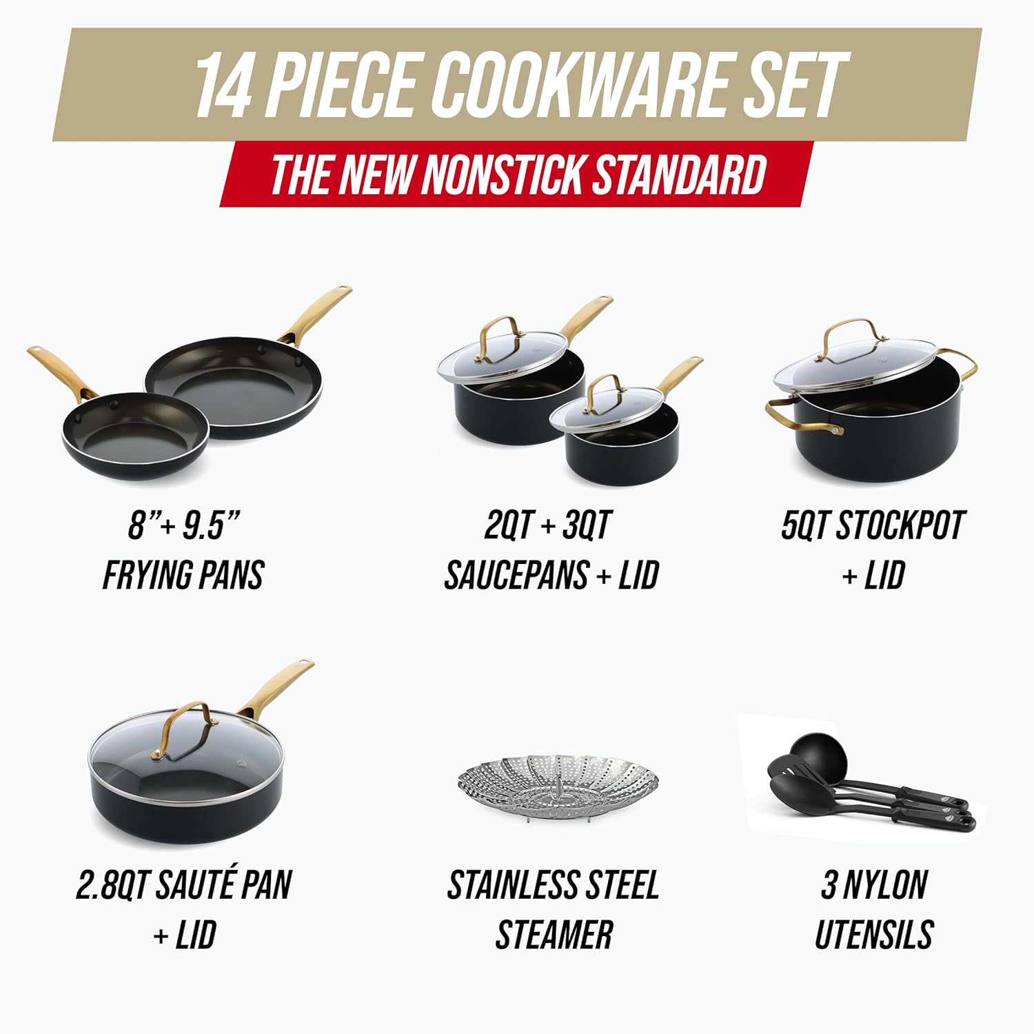 14-PIECE PREMIUM SET: 2QT & 3QT Saucepans, 5QT Stockpot, 8″ & 9.5″ Frypans, 2.78QT Sauté Pan (all with lids), Stainless Steel Steamer, 3 Nylon Utensils