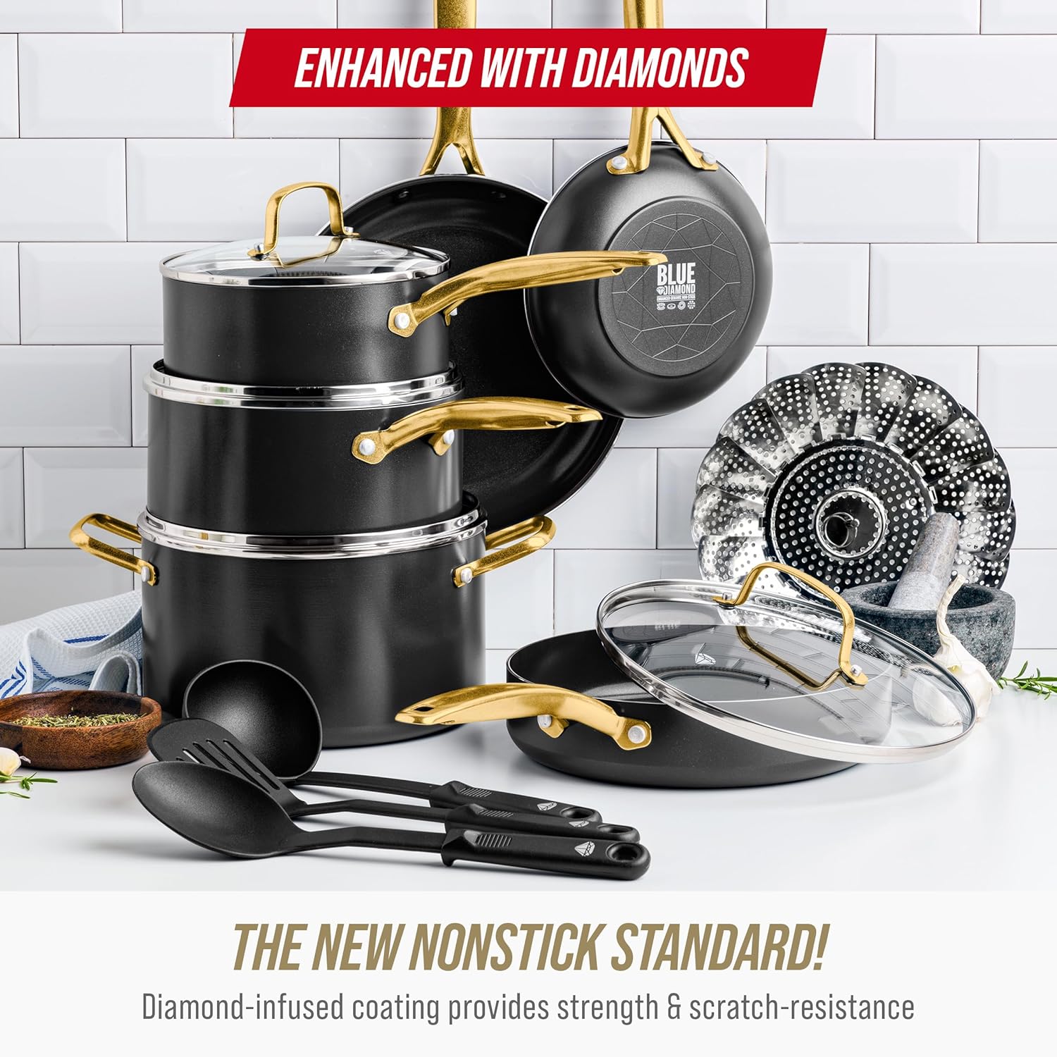 DIAMOND-INFUSED NONSTICK: 60% tougher coating, metal utensil safe, 2x longer lasting than traditional nonstick