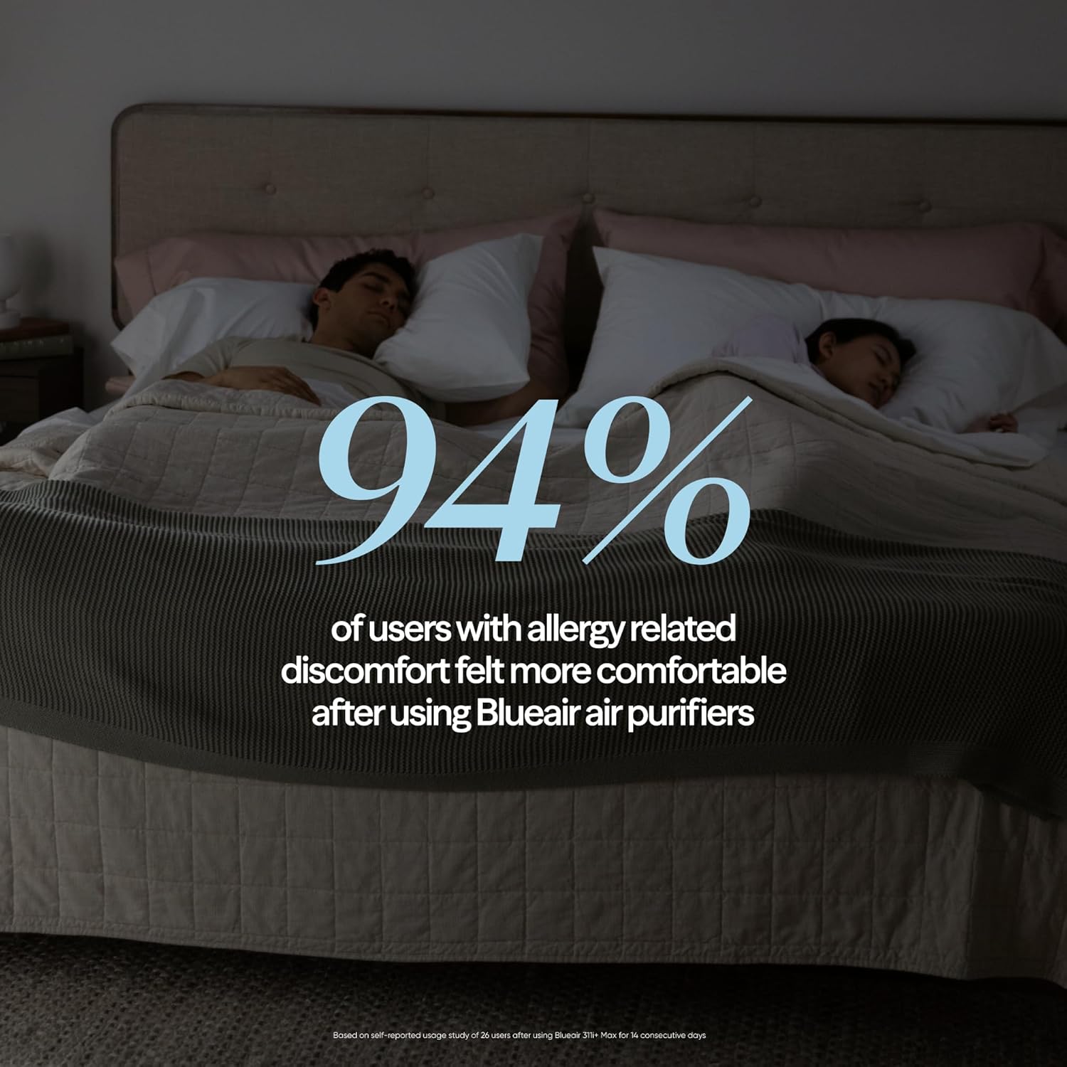 Blue Pure 311i Max HEPASilent™ smart air purifier quickly cleans up to 929sqft living space in 30min or 387sqft medium room in about 12.5min on high. Independently evaluated for safety standards and third-party tested for performance as part of the AHAM Verifide® Program for air cleaners, this air purifier has a Clean Air Delivery Rate (CADR) of 250 for fine smoke particles, dust and pollen. Get more out of the filter thanks to our proprietary RealTrack algorithm where fan speed, usage time and pollution levels are used to calculate exactly how dirty the filter is based on actual usage and tells you more accurately when to replace it within 9 months. Shop genuine Blueair Blue Pure F3MAX replacement filters designed for optimal performance: Blue Pure 311i Max air purifier replacement filter B08KPDS2CY. Blueair is the only line of air purifiers with a customizable, washable fabric pre-filter. Inspired by the latest Scandinavian design trend, Blue Pure Max air purifiers arrive in the Stockholm Fog pre-filter, while Limestone, Moss and Sand pre-filters are sold separately. *Comparing pollen CADR on high fan speed (Blue Pure 411a Max & 411i Max vs. Blue 411 Auto), other units may vary. Based on AHAM maximum allowable certified rating which may vary from the AHAM seal claimed valued. Noise refers to the dB(A) difference in acoustic power. **When similar CADR was measured, Blueair models with mechanical and electrostatic filtration achieved less noise with less energy than same models with only H13 HEPA mechanical filtration. ***Tested PM 2.5 (0.1 – 2.5 microns) up to 90min in a 30m3 room. Tested to remove min. 99.9% of S. aureus, K. pneumoniae, P. aeruginosa, MS2, E.Coli, H1N1, A.Niger.