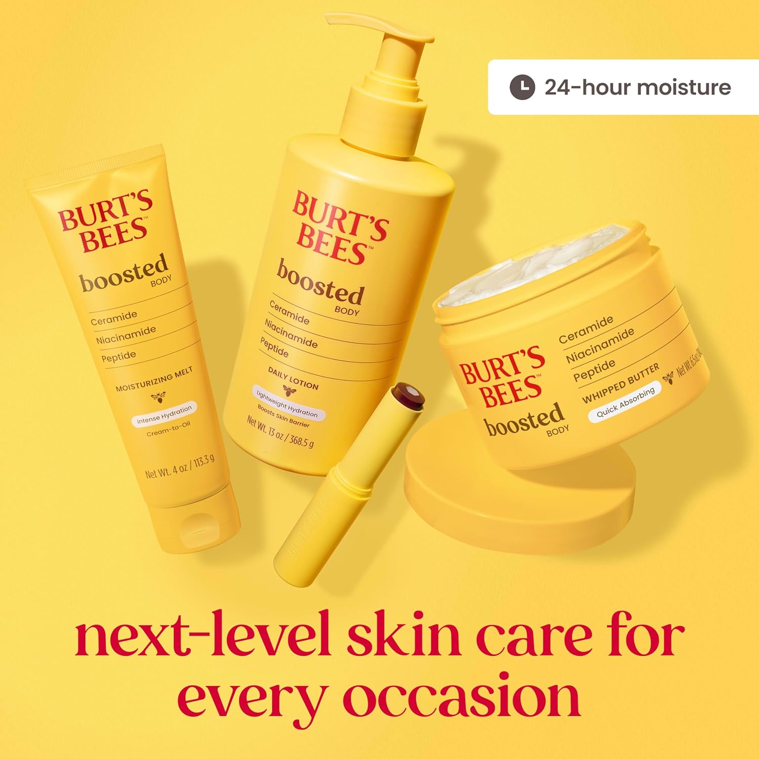 Elevate your skin care routine with Burt’s Bees Boosted Body Lotion, a lightweight daily lotion formulated to help boost skin barrier. Packed with powerful ingredients, this body moisturizer is formulated with a ceramides, niacinamides and peptides complex. It locks in moisture, smooths skin and supports natural collagen production. The lightweight lotion absorbs quickly while providing long-lasting skin hydration without greasy residue. It has an energizing scent that is vibrant and tropical with notes of guava and melon, complemented by exotic grapefruit, sheer florals and a smooth blend of amber woods and musk. This Burt’s Bees lotion is formulated without parabens, phthalates, petrolatum or SLS, and it’s safe for sensitive skin. Burt’s Bees is Leaping Bunny Certified (we never test our products on animals). Apply this lotion daily to dry skin during your morning or evening skin care routine for 24-hour hydration. Pair the lotion with other Burt’s Bees Boosted Body products.