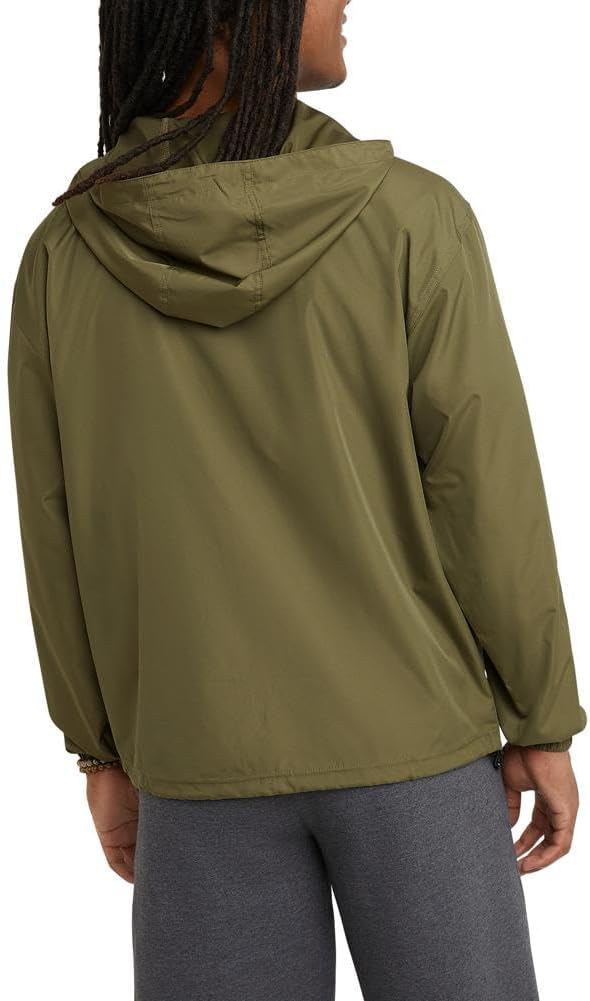 WEATHER ANY STORM. Wind-resistant and water-resistant, this ultra-light men’s rain jacket can be towed along on all your outdoor endeavors. Ready to protect you from the elements, it features a full-zip front, a scuba-style neckline, and a hood with a bungee cord closure. This jacket is roomy enough for easy layering over your best Champion sweatshirt. Smart details include rain flaps in front and back, elastic cuffs that keep out wind and rain, and a bungee cord hem that adjust for a custom fit. This rain jacket for men has front pockets that keep essentials close. The iconic script logo at the left chest is recognizable on and off the field.