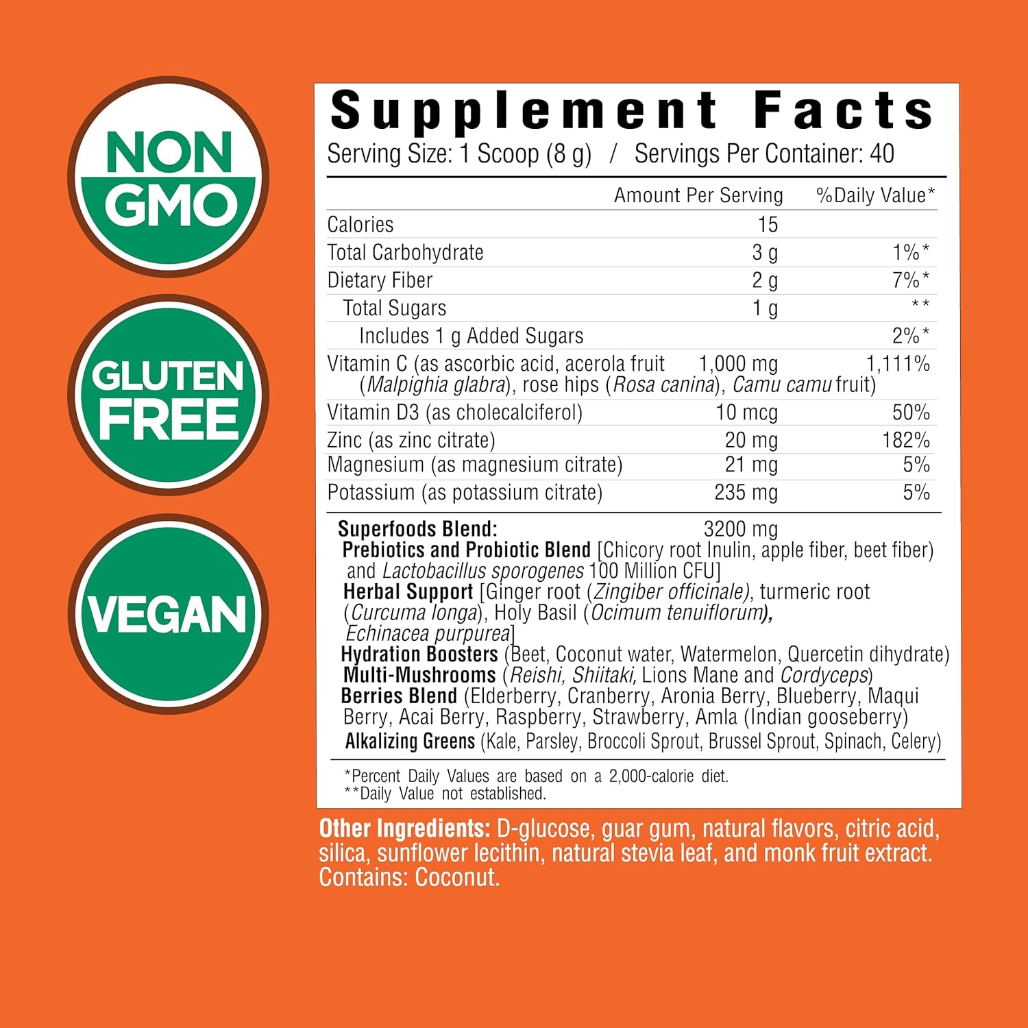 Country Farms Immune defense superfoods is also packed with 1, 111% Daily Value of Vitamin C and 182% Daily Value of zinc for maximum benefit. Your body’s immune defense starts with Vitamin C, a powerful antioxidant that supports immunity. Zinc is commonly used to support wellness, while elderberry and mushrooms have been used for centuries to support immunity. Thanks to its blend of probiotics and prebiotic fiber, Country Farms Immune defense superfoods helps support digestive health.