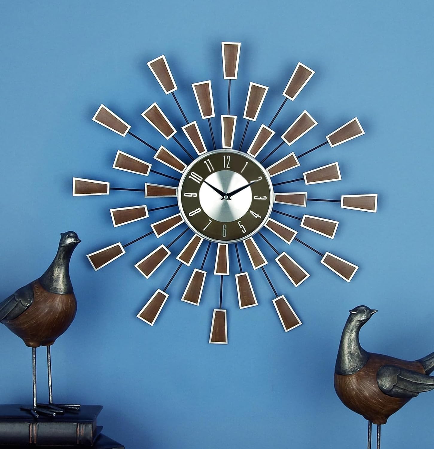 This modern wall clock for kitchen features a welded iron base with slim metal rods carrying the iron and wood accents. The satin brown oversized wall clock features a windmill-like design with protruding metal rods tipped with rectangular accents. Wipe clean with a dry cloth. Perfect for the dining room or kitchen walls, this brown wall clock for home features protruding spokes with rectangular accents forming a windmill design. Requires 1 AA battery, not included. This item ships in 1 carton. The clock features silver number markers with a brown highlight and a pair of black clock hands in a sliver background. The clock mechanism runs silent. Iron wall clock makes a great gift for any occasion. Can be hung vertically using the keyholes; nails and screws not included. Suitable for indoor use only. This item ships fully assembled in one piece. This is a single brown colored kitchen clock. Modern style.