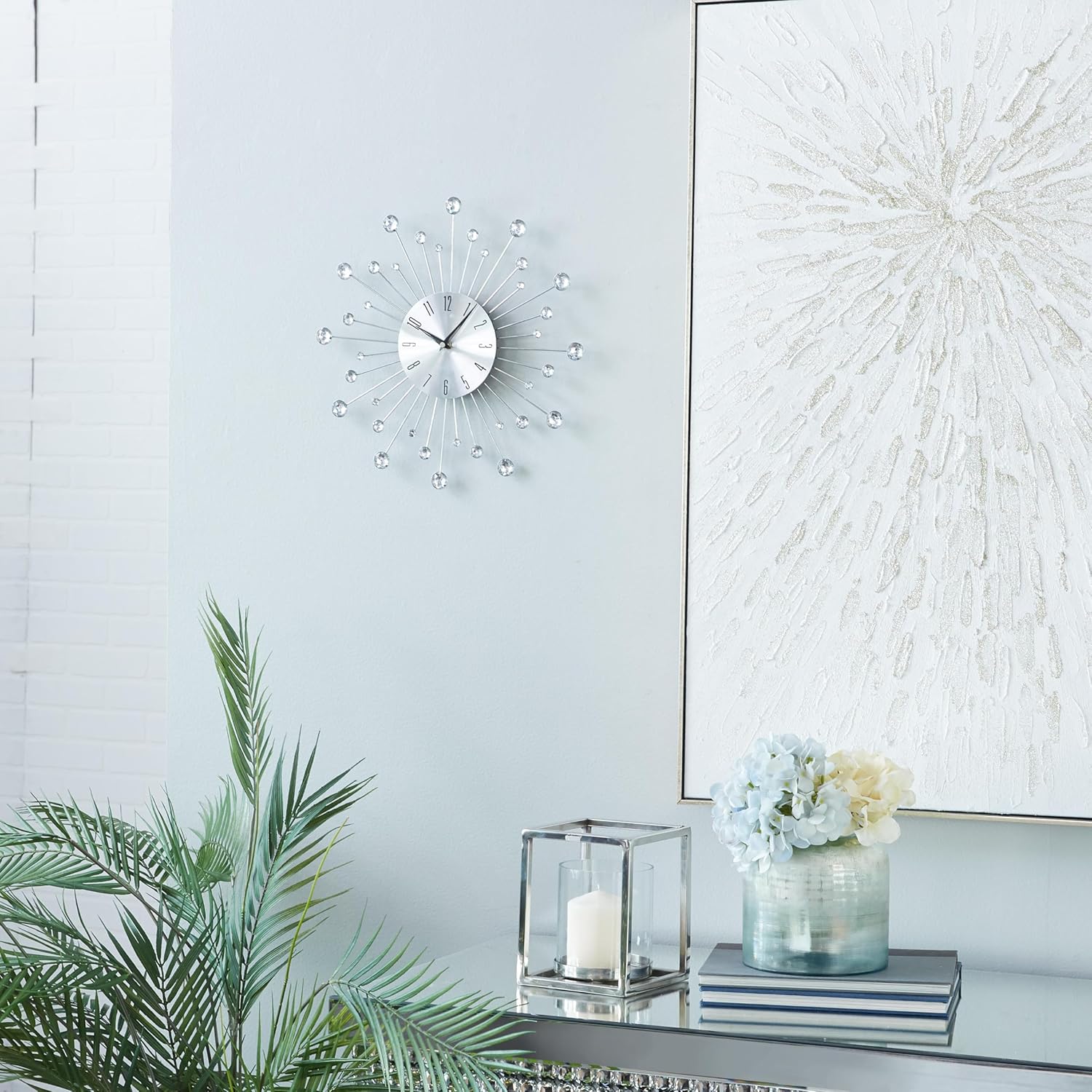 Add a hint of glamour to your home with this silver clock ideal for light-colored interior styles. Requires 1 AA battery. Battery not included. This item ships in 1 carton. Features Arabic numerals for the hour markers. The clock mechanism runs silent. Iron wall clock makes a great gift for any occasion. Item comes with keyhole slots for a vertical hang; nails and screws are not included. Suitable for indoor use only. This is a single wall clock. Glam style.