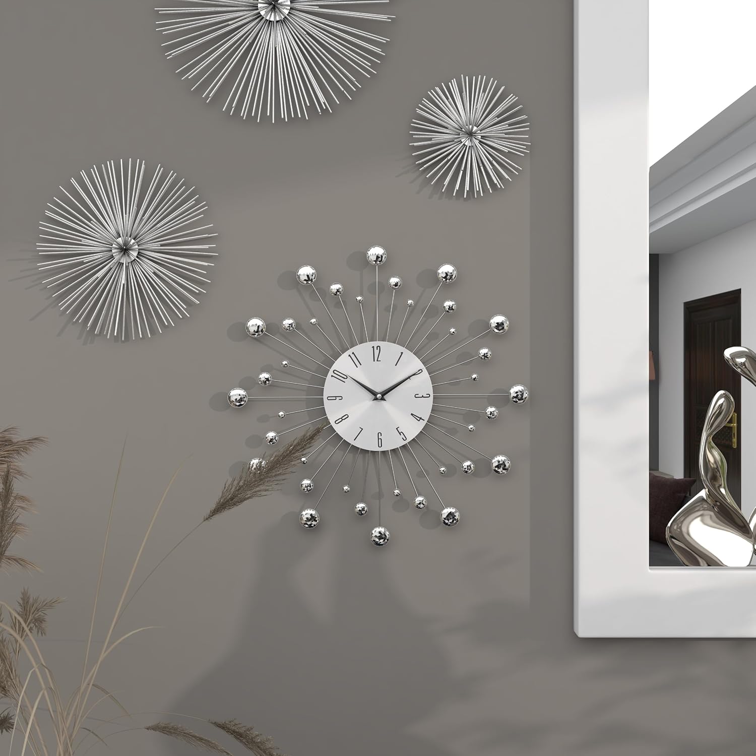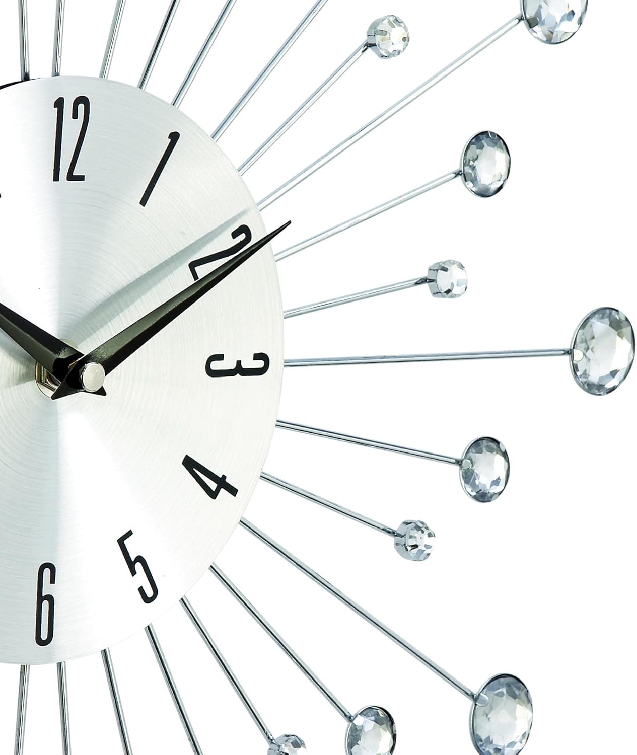 FEATURES ROUND WALL CLOCK: Features a minimalist clock face with black numerals and clock hands, with silver metal rods in different sizes and come with clear bead tip