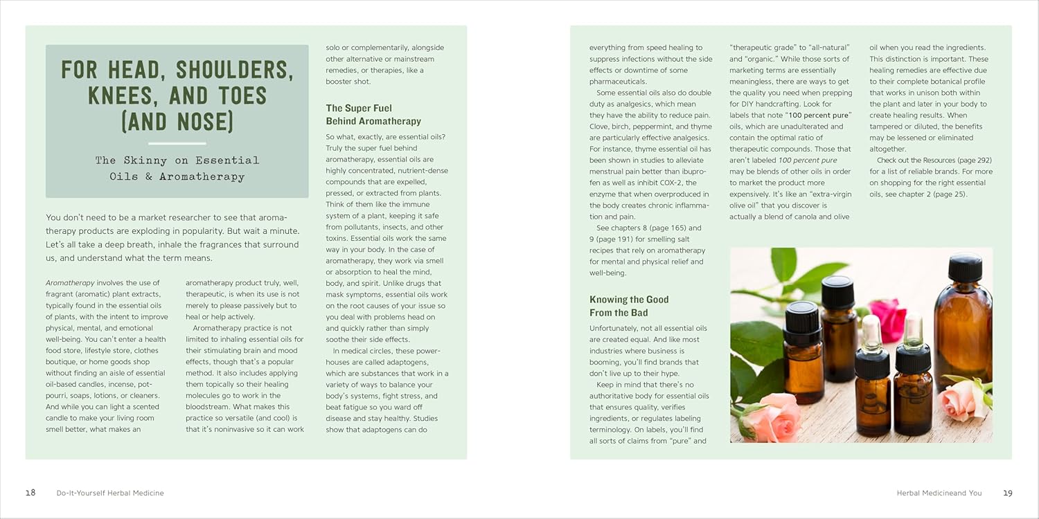 Down-to-earth info on the exploding popularity of essential oils and why they’re so effective.In-depth profiles of 5 must-have herbs to kick off your herbal medicinal projects, as well as 30 additional herbs to get to know and use.Over 200 recipes for face and hair care, body and skin care, intimate care, mental health and wellness, common ailments, home cleaning products, and self-care.