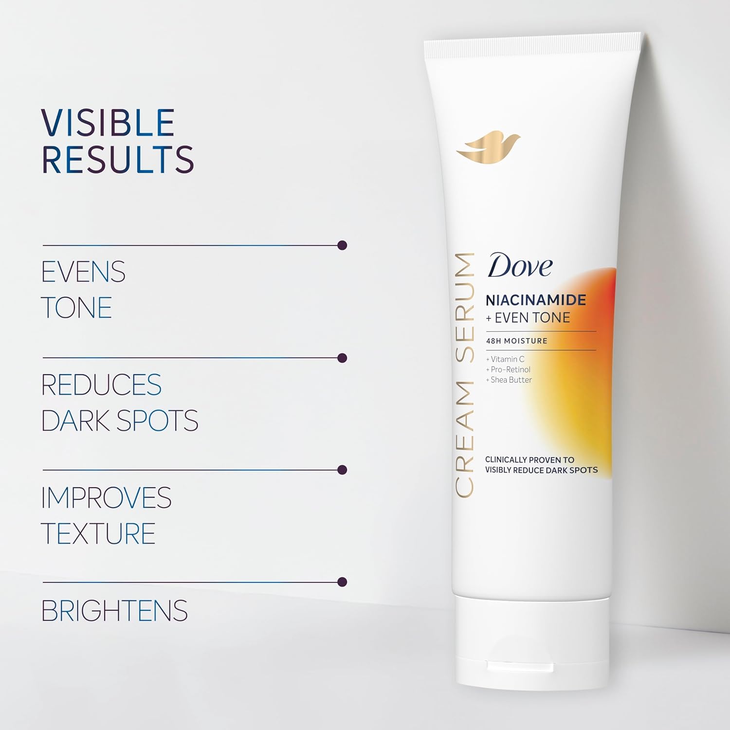 Dove Niacinamide + Even Tone Cream Serum is a non-greasy, fast-absorbing, lightweight, all-over body serum that delivers next-level skin care that goes beyond moisturization. This high-potency body serum is made with face care ingredients and supports skin’s natural regenerative process for visible results: reduces dark spots, minimizes signs of sun damage like uneven tone, and improves skin texture for brighter, smoother, more radiant skin. Our individual skin needs are unique and varied, requiring tailored solutions to effectively address skin concerns. Visible skin health and radiance can be compromised by a variety of factors leading to dark spots, uneven tone and texture, redness, dullness, and irritation from dryness. Dove Cream Serums were developed with dermatologists with the purpose of bringing the potency and efficacy of face serums into body care. This body serum is a science-backed formula that delivers 48-hour moisture, is clinically proven to visibly reduce dark spots, and is made with face care ingredients Niacinamide, Vitamin C, Pro-Retinol and Shea Butter. Dove Cream Serums are clinically tested with over 1,000 women to ensure safety and efficacy across all skin types. This formula is designed for all-over, daily use in place of body lotion and has a velvety application tested and loved by real women. Other skin needs or concerns? Explore our full range of Dove Cream Serum dermocosmetic solutions – all developed with dermatologists, designed for all skin types and tones, suitable for sensitive skin, and proven for visible results.