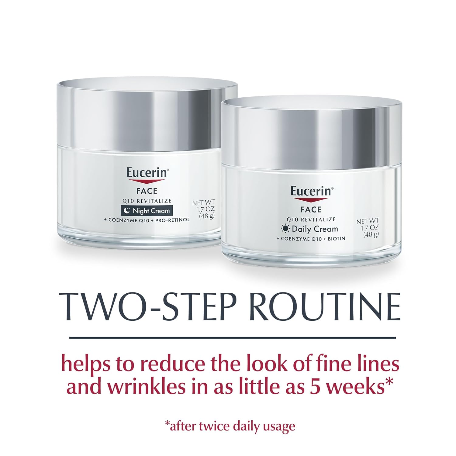INCLUDES: One 1.7 ounce jar of Eucerin Q10 Anti Wrinkle Face Cream and one 1.7 ounce jar of Eucerin Q10 Anti Wrinkle Night Face Cream