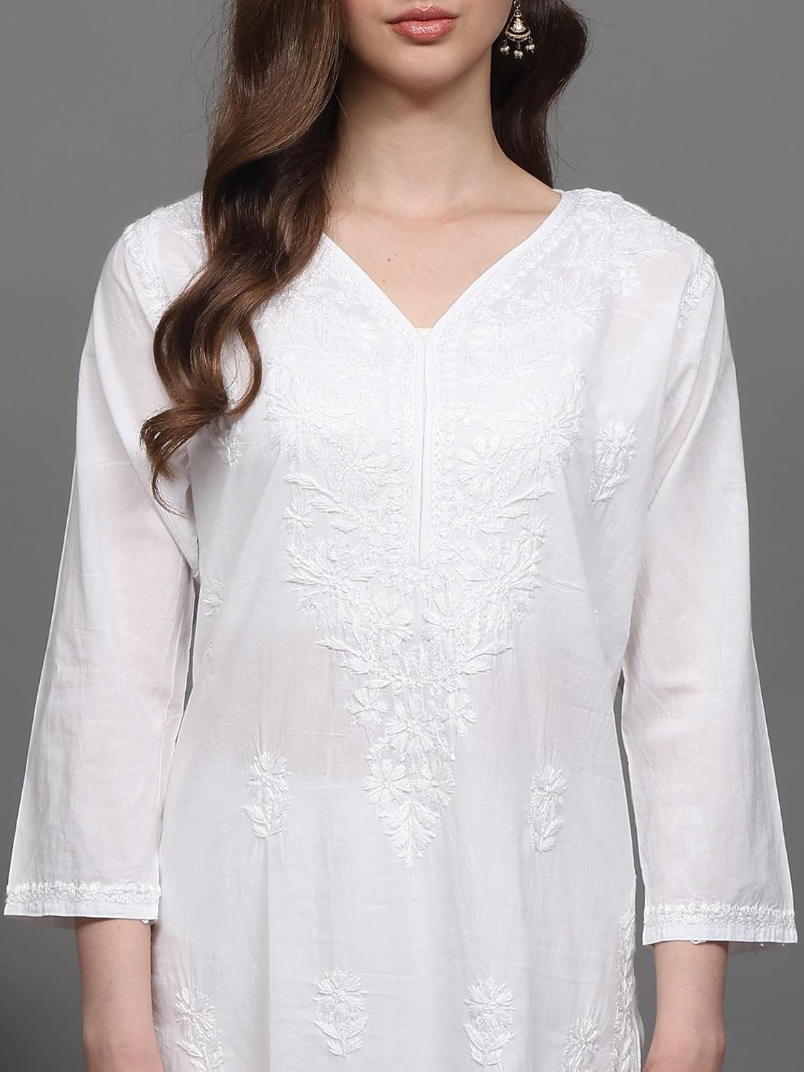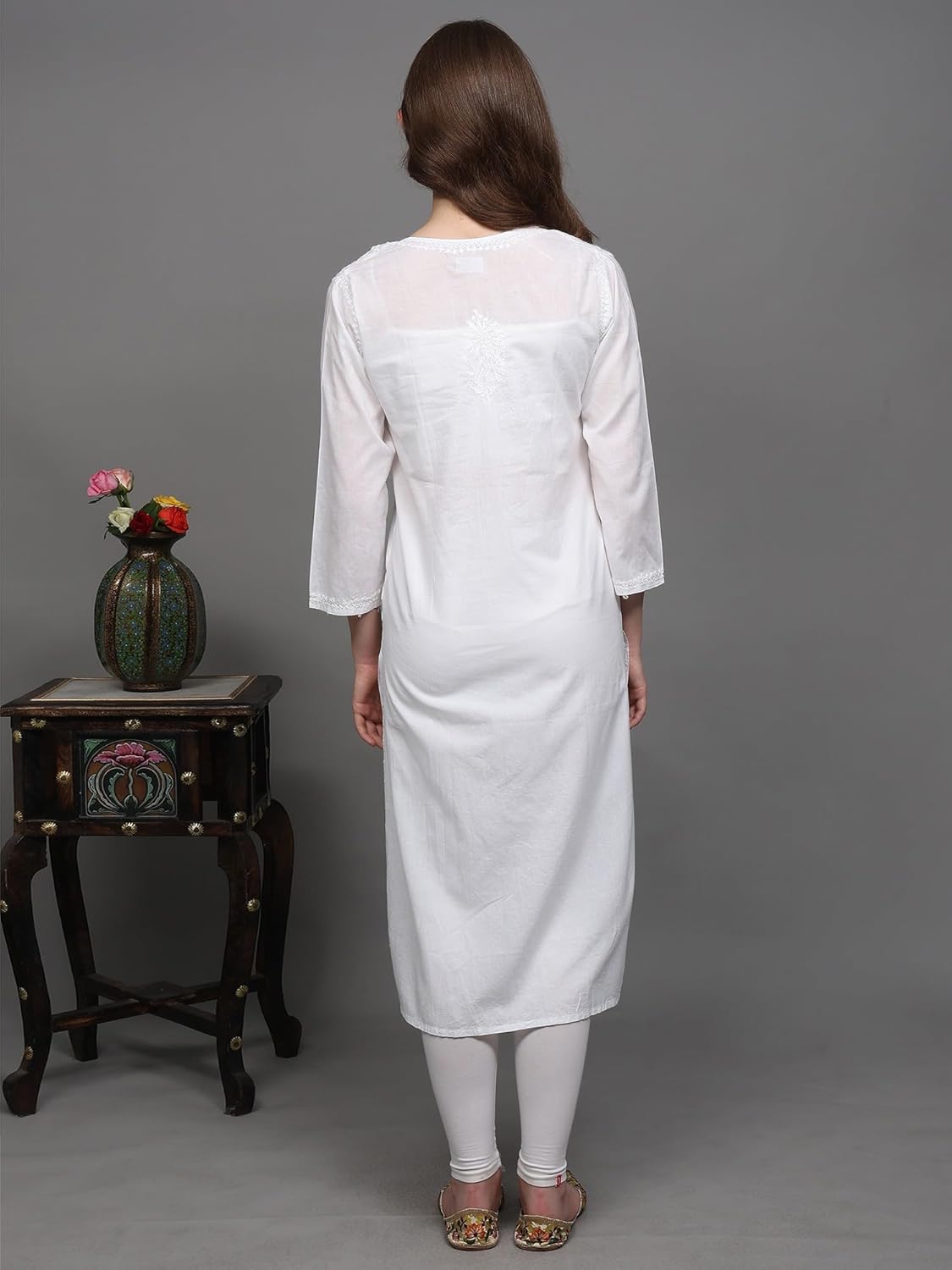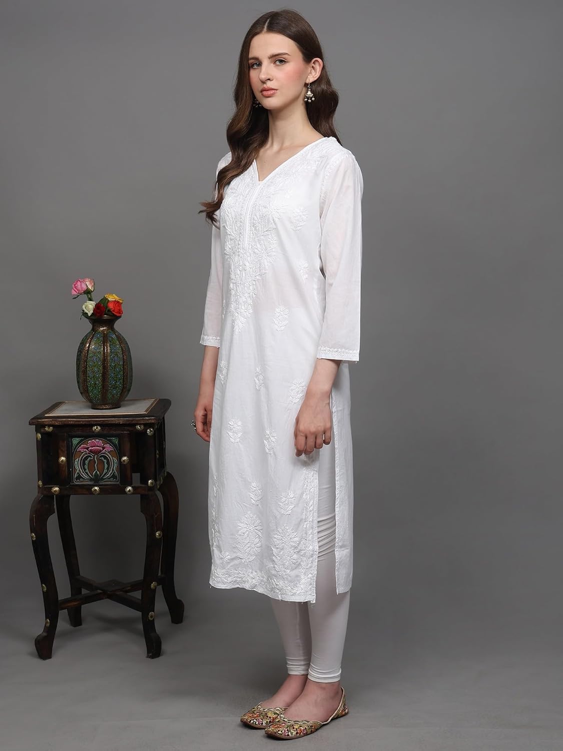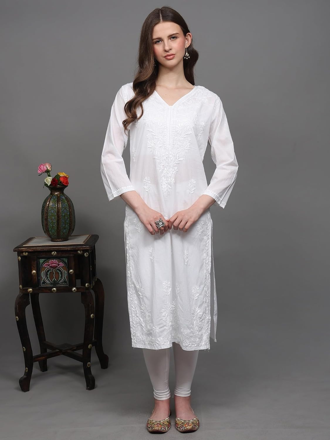 Exotic India Art Pvt. Ltd. The pristine white hue serves as a canvas for the intricate Lukhnavi Chikankari embroidery, creating a garment that’s both understated and captivating. Perfect for a variety of occasions, from casual daytime outings to more formal gatherings, this kurti offers versatility and style. Its classic design ensures that it will remain a cherished piece in your wardrobe for years to come. The V-neck design adds a touch of modernity, while the long length provides ample coverage and can be effortlessly paired with leggings, palazzos, or jeans, depending on your personal style. The beauty of this kurti lies in its versatility. For a relaxed daytime look, pair it with simple cotton leggings and comfortable sandals. Elevate your outfit for evening events with elegant jewelry, a statement scarf, and heels or embroidered flats. The neutral color palette makes it easy to accessorize with a wide range of colors and styles. Experiment with contrasting accessories for a bold statement or opt for delicate, complementary pieces for a subtle, sophisticated look.