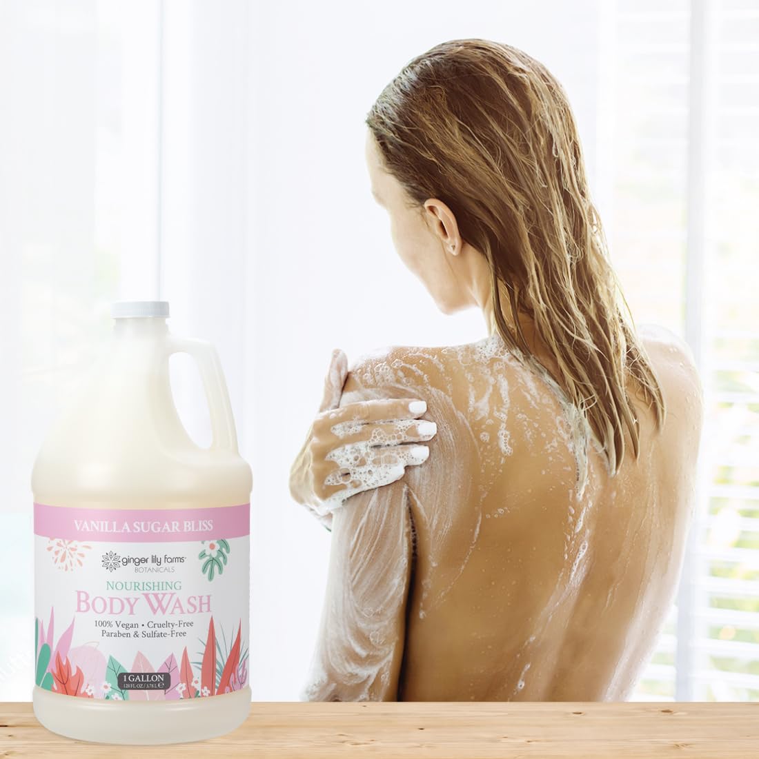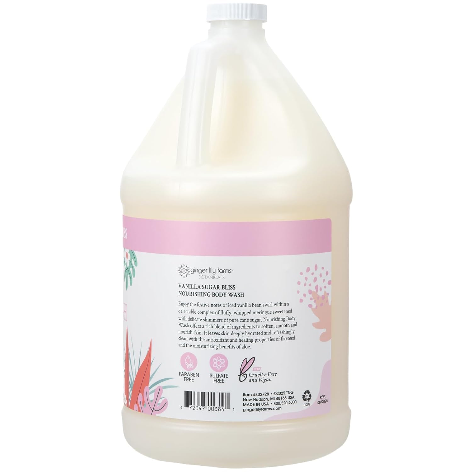 Ginger Lily Farms Botanicals Vanilla Sugar Bliss Nourishing Body Wash offers a rich blend of ingredients to soften, smooth and nourish skin. It leaves skin deeply hydrated and refreshingly clean with the antioxidant and healing properties of flaxseed and the moisturizing benefits of aloe. Enjoy the vibrant aromatic combination of tender herbs, crisp eucalyptus leaves, and sheer lavender essence swirled with pure geranium and a hint of frosted spearmint. Easily lathers on the skin to wash to away dirt, oil and bacteria. Natural spa quality formula contains no harsh chemicals like parabens, sulfates, phosphates or gluten and is gentle enough for even the most sensitive skin. Ginger Lily Farms Botanicals Nourishing Body Wash is 100% vegan, cruelty-free and PETA certified so you can feel good while using it. Refill size is perfect for fitness centers, locker rooms, spas and home use.