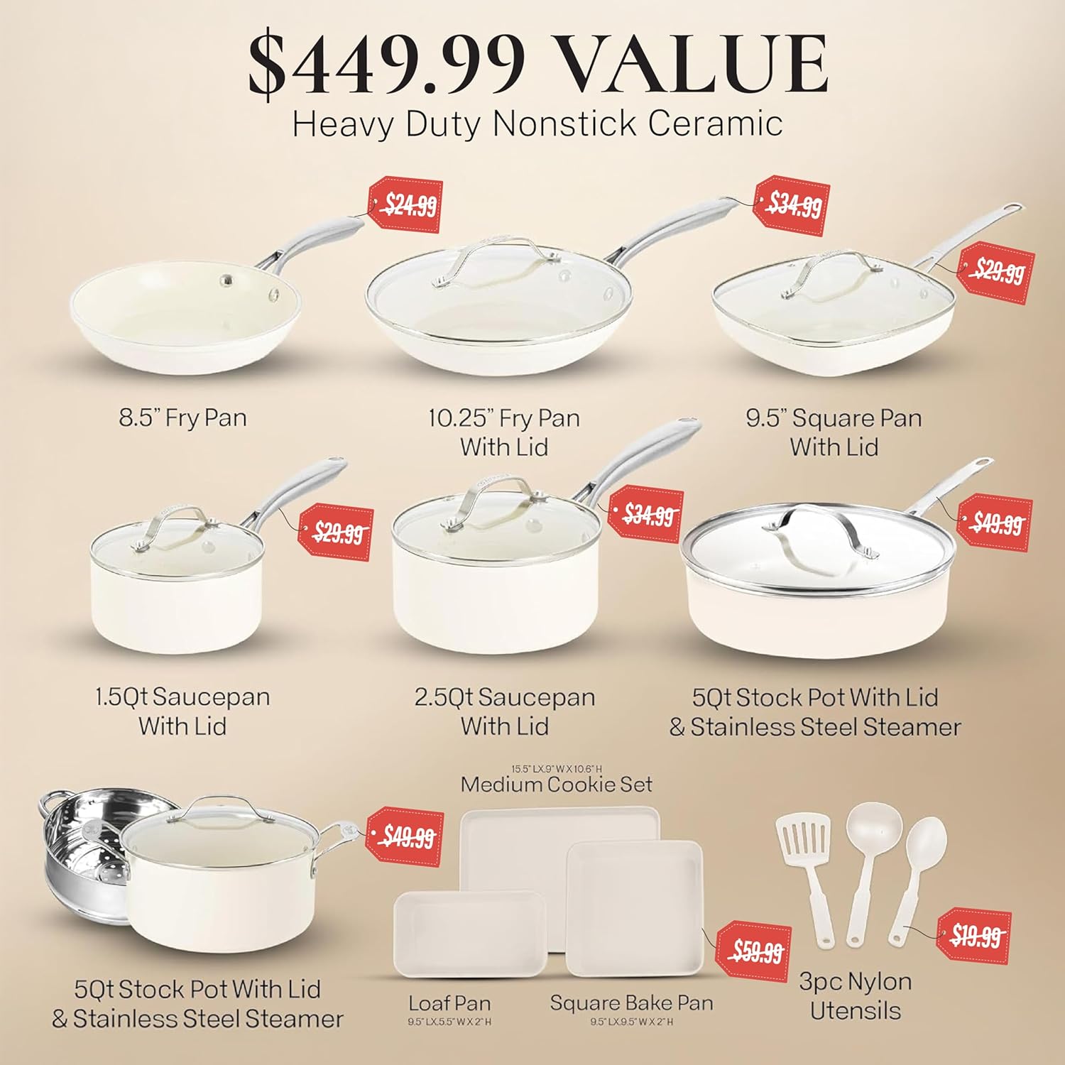 GOTHAM STEEL 20 Pc Ceramic Cookware Set Nonstick, Ceramic Pots and Pans Set Non Stick for Kitchen with Bakeware, Cooking Utensils & Steamer, Non Toxic PFOA PFOS Free, Oven & Dishwasher Safe