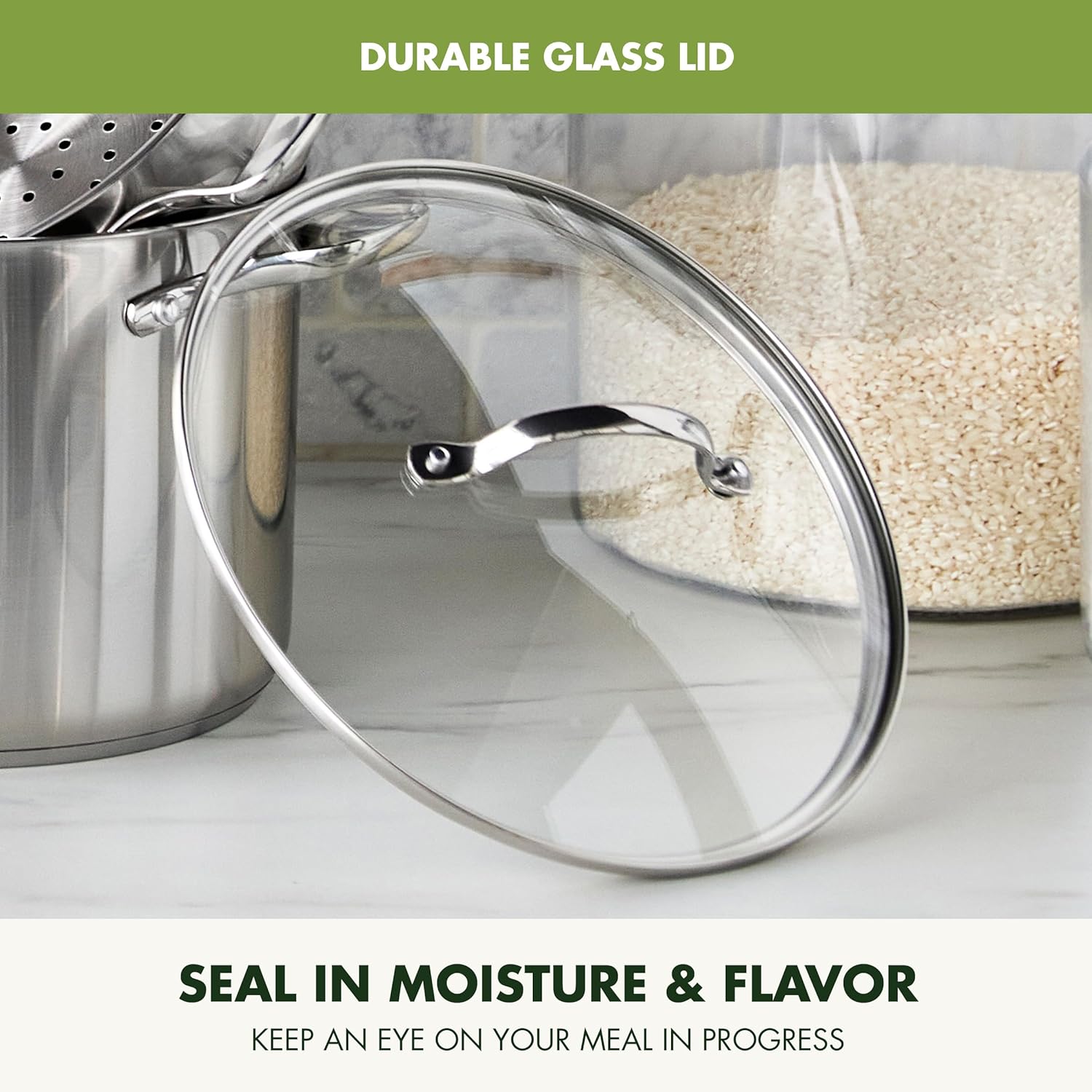 Crafted with ultra-durable stainless steel, this cookware ensures years of reliable performance. The layered stainless steel base with an aluminum core provides quick and even heating, eliminating hot spots for perfect results. The set is oven and broiler safe up to 600°F (lids up to 425°F) and works on all stovetops, including induction. The riveted mirror-polished stainless steel handles offer a secure, stay-cool grip for safe handling. Tempered glass lids help retain heat, moisture, and flavor while allowing you to monitor cooking without lifting the lid. For easy cleanup, the set is dishwasher safe, though hand washing is recommended. GreenPan Swift is built for both durability and performance, ideal for everyday cooking.