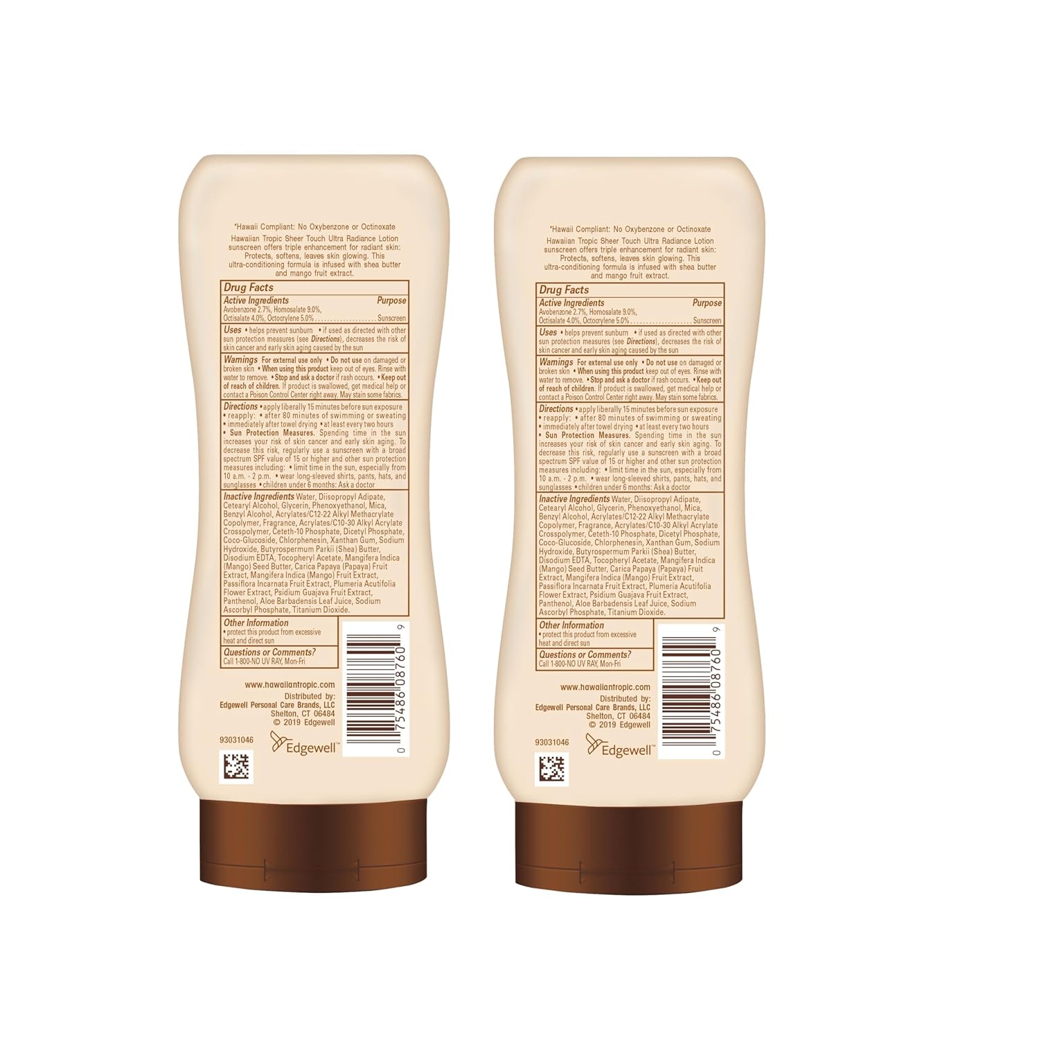 Hawaiian Tropic Sheer Touch Ultra Radiance SPF 30 travel size sunscreen lotion offers triple enhancement for radiant skin; it protects, softens, and leaves skin glowing. This luxurious formula has a hint of sheen and leaves your skin soft and luminous. Hawaiian Tropic Sheer Touch sunscreen lotion offers broad spectrum UVA and UVB protection in an oil-free and non-greasy formula. This ultra-conditioning formula contains Vitamins C & E, with mango fruit extract and a shea butter complex for skin-loving suncare you can trust. We care for your skin with broad spectrum UVA and UVB protection, and we also do our part to help care for the planet by creating Cruelty-Free sunscreen that’s free from oxybenzone and octinoxate.