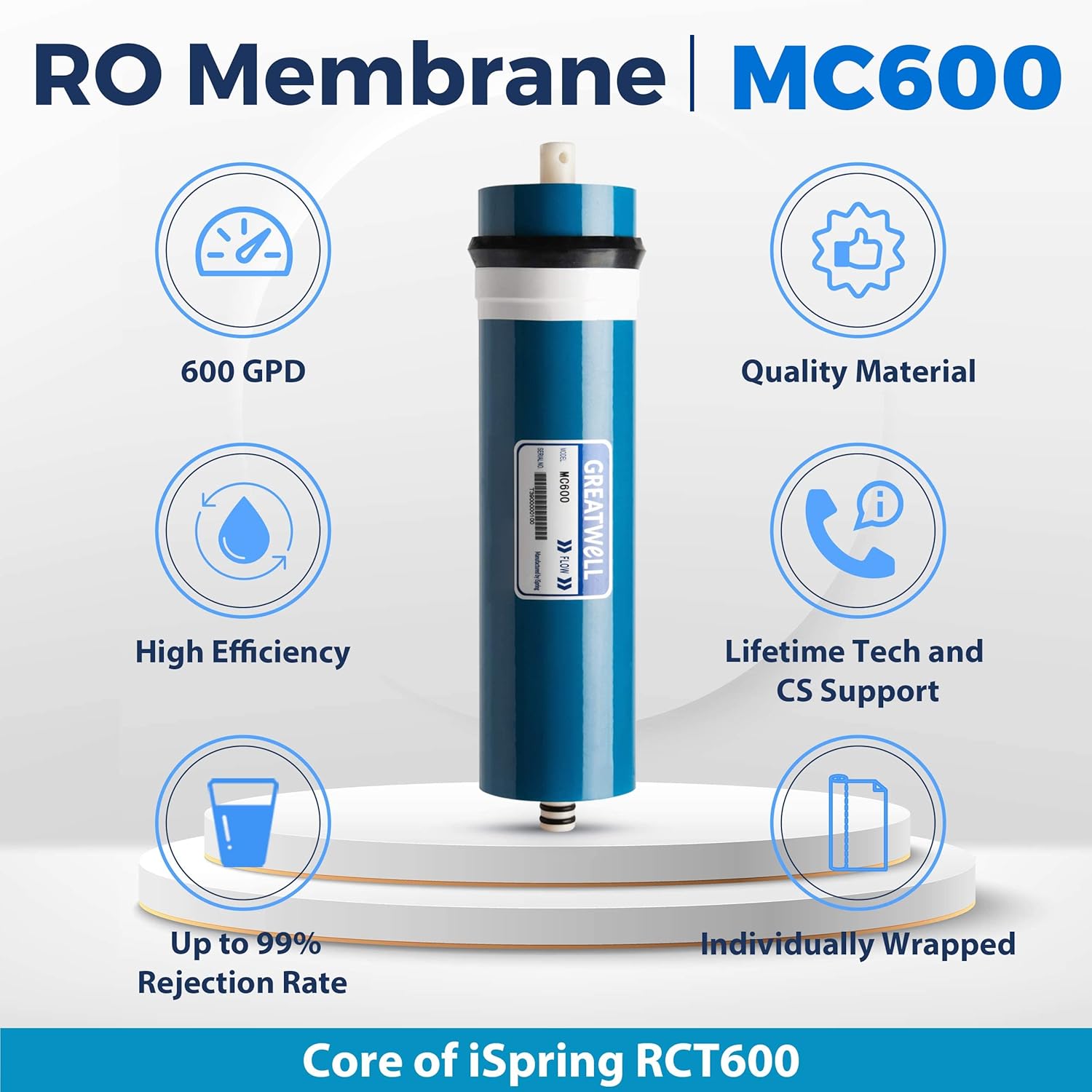 Dedicated RO membrane for iSpring countertop RO water filter system RCT600. Experience clean and fresh water every time you turn on your drinking water faucet.