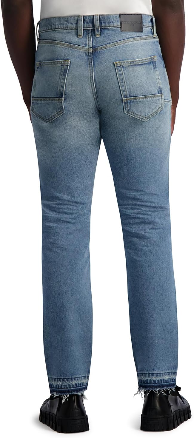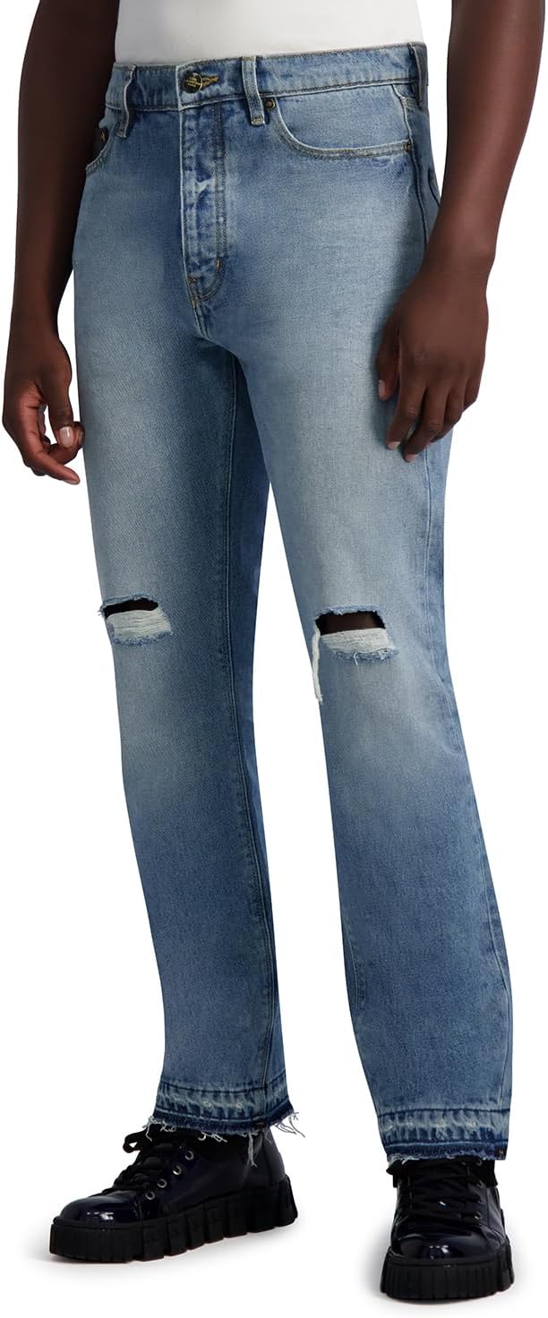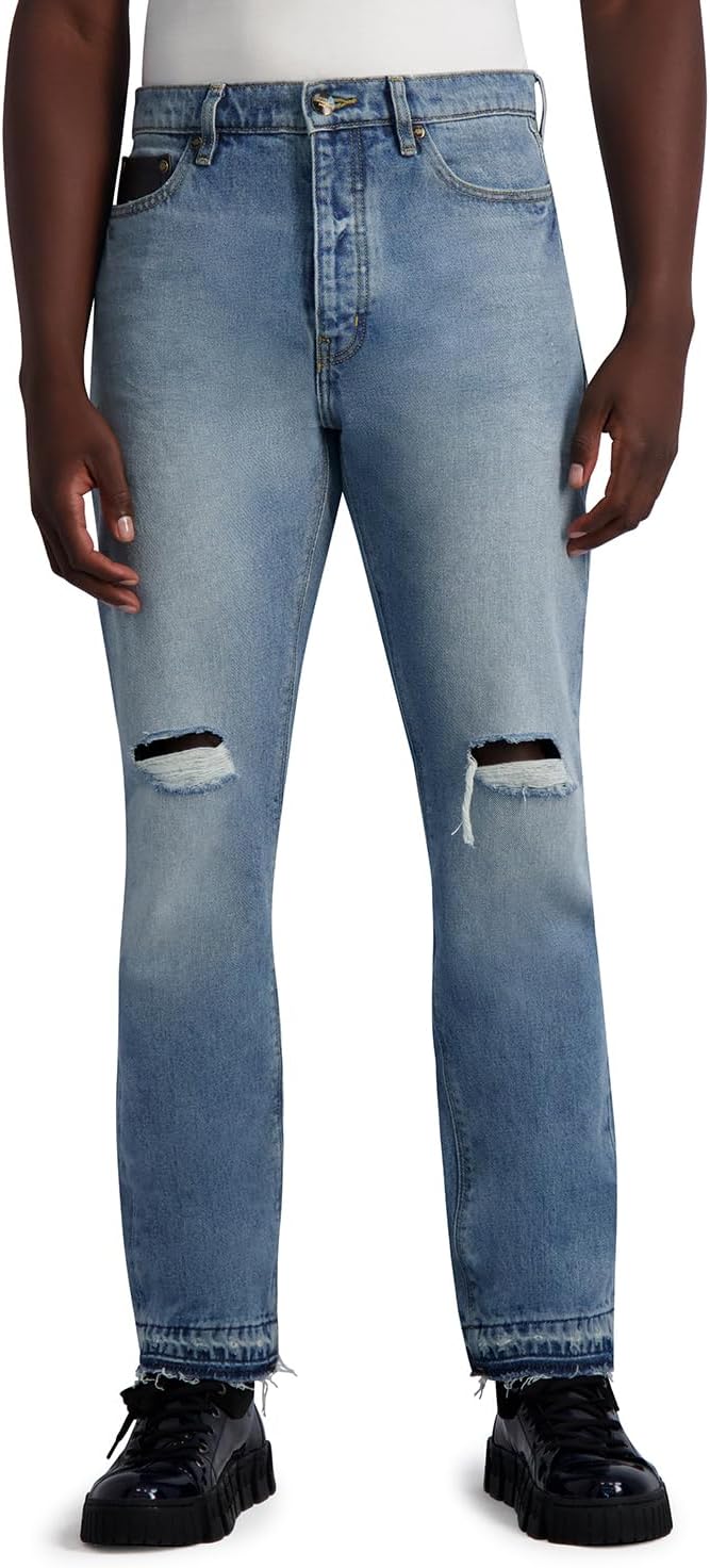 This Karl Lagerfeld Paris Men’s Sportswear pant is a Light Wash Denim Leather Pocket Relaxed Fit relaxed fit light wash denim pant with leather coin pocket