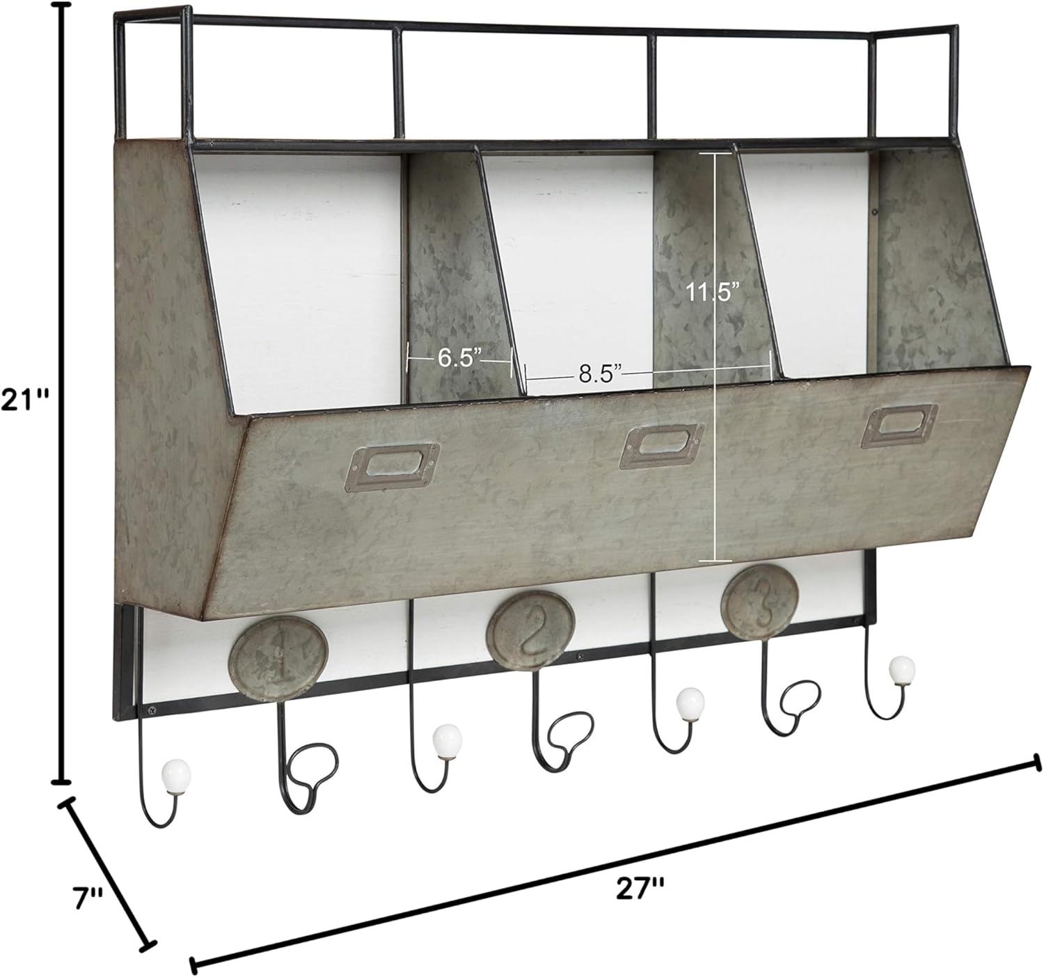 The storage bins are constructed of rustic solid wood and galvanized metal. Keyhole hangers are welded on to the frame for easy and secure wall display