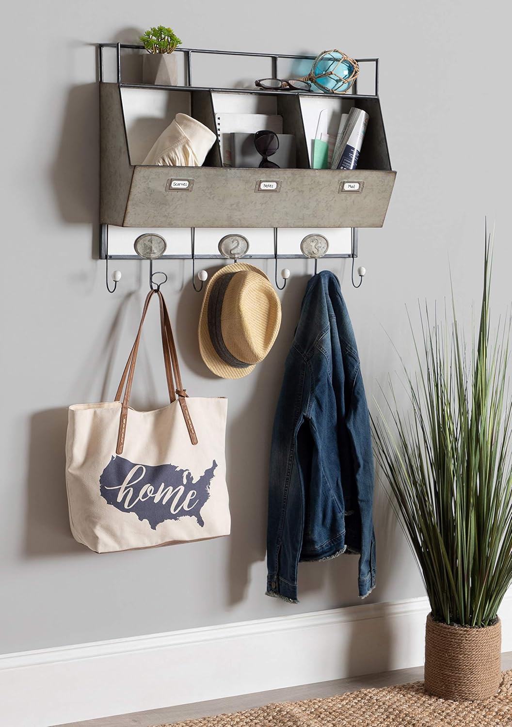 The Arnica 3-Pocket Wall Storage Unit with 7 metal hooks combines rustic farmhouse home decor with fantastic functionality