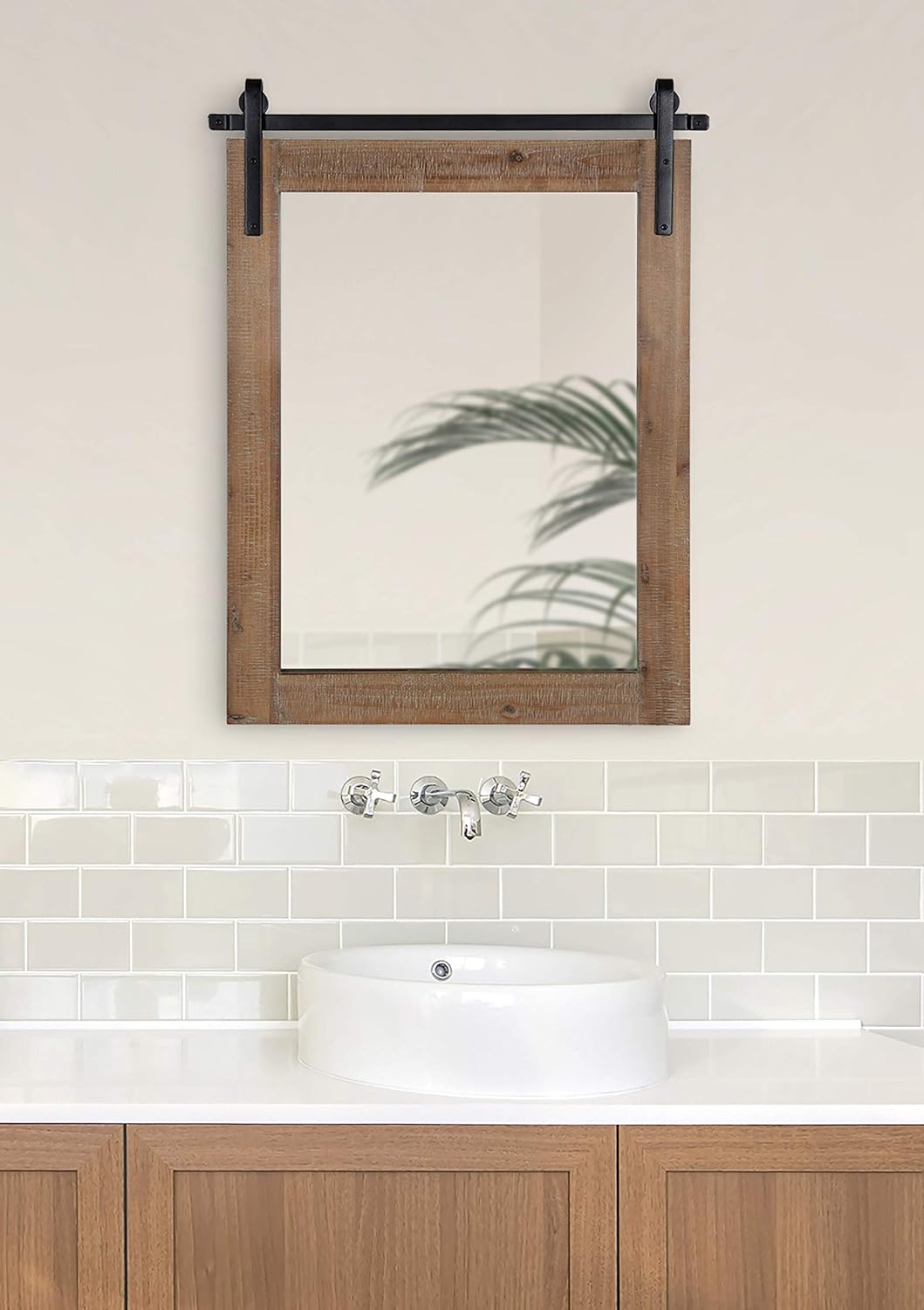 RUSTIC FARMHOUSE MIRROR: The Cates mirror features a barn door-inspired design with a rustic brown finish and black iron bracket inspired by sliding barn doors