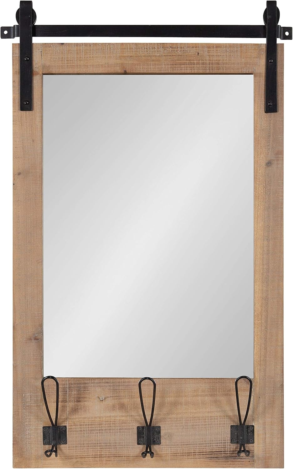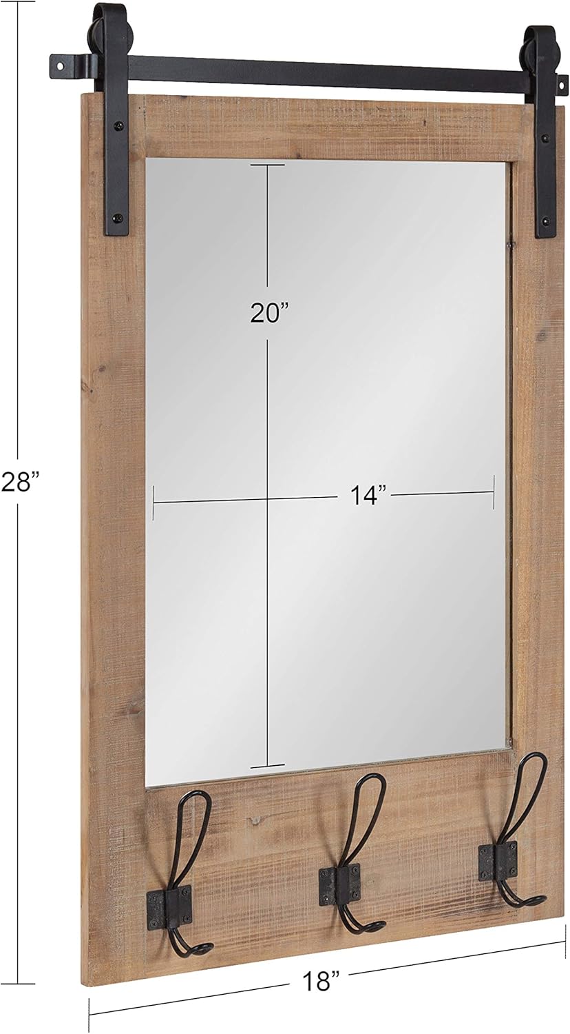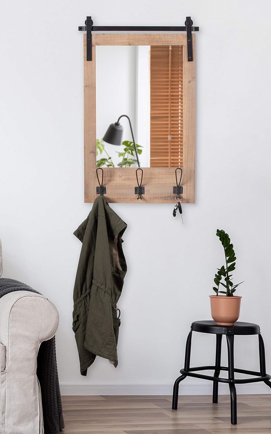 FARMHOUSE LOOK: This wall mirror features the iconic look of a barn door with the addition of functional hooks to hang household items