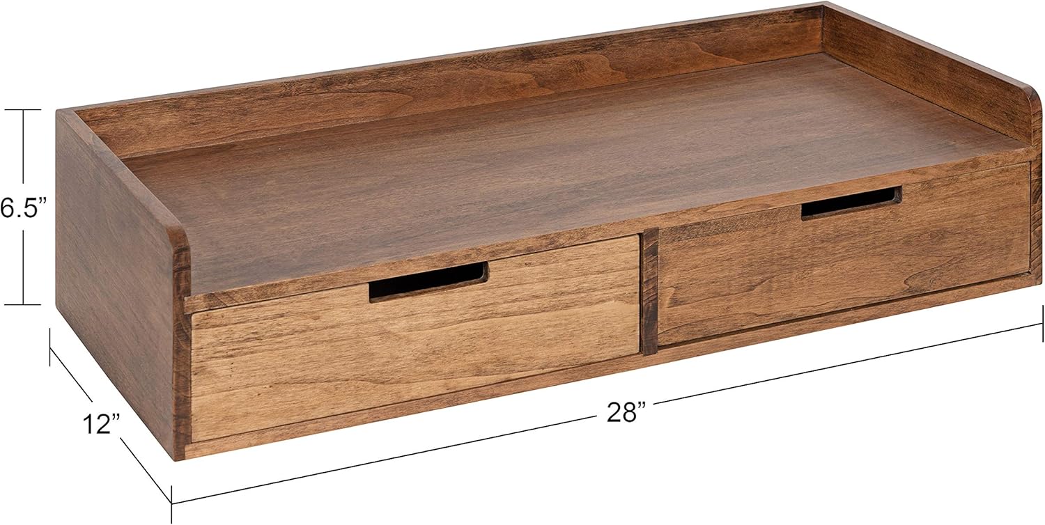 AMPLE SIZE: The overall dimensions of the Kitt floating shelf with drawers are 28 inches wide by 12 inches deep by 6.5 inches high, which is an excellent size for displaying keepsakes or using as using as a desk for homework and home schooling