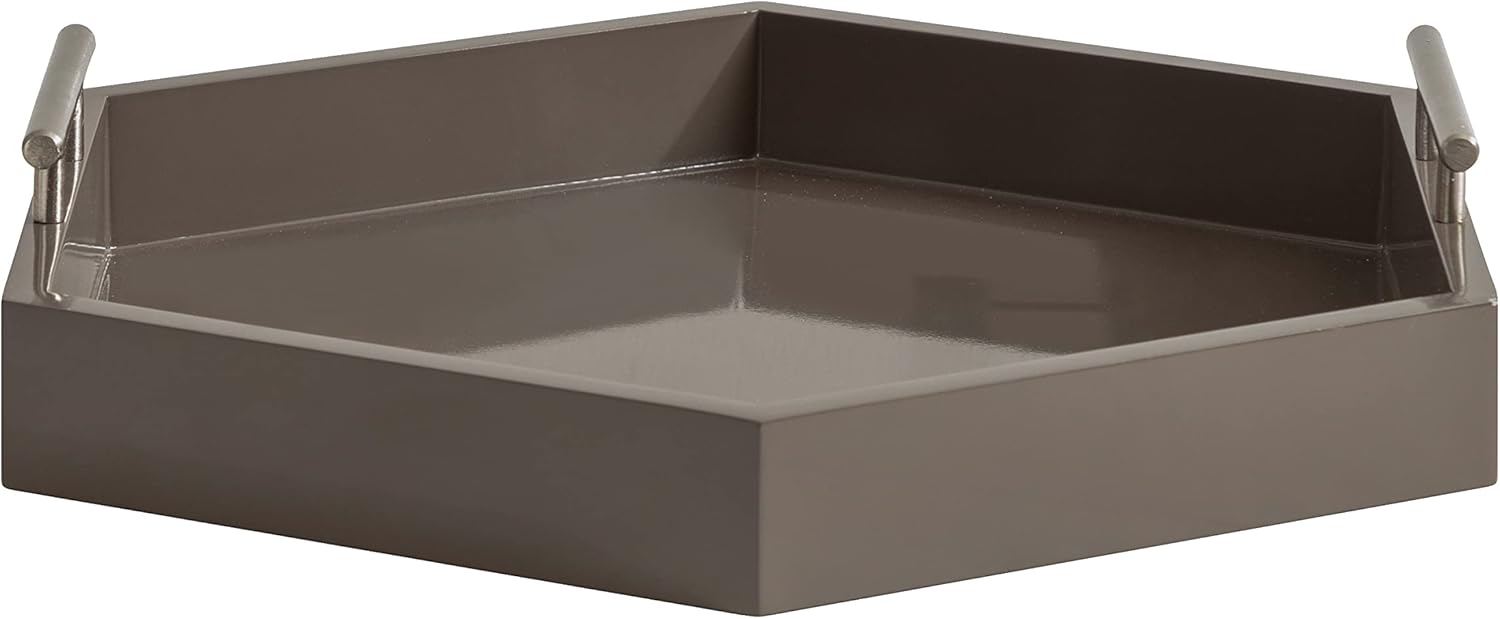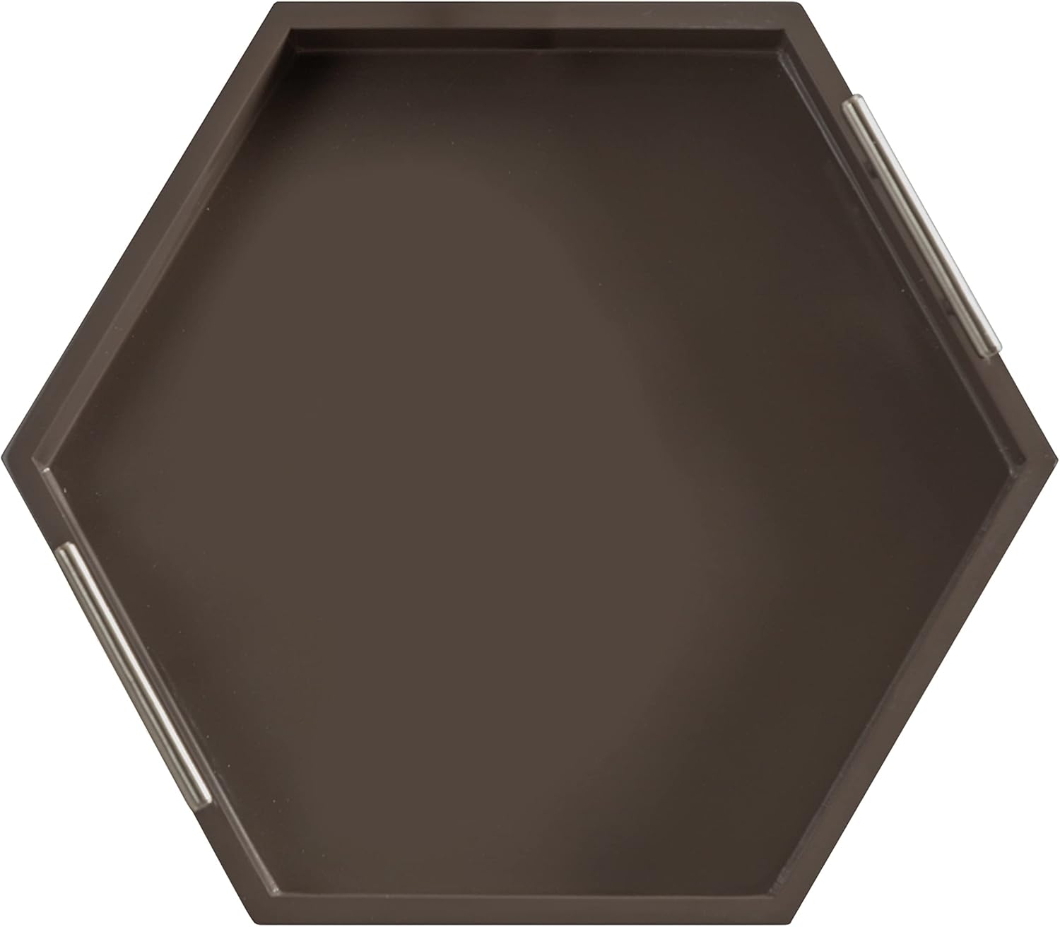 Bring modern style into your home with this hexagon-shaped Lipton tray with metal handles. It’s fantastic for use as storage or display, showcasing anything from plants, photos, or keepsakes. The Lipton tray has plenty of functions to add style and convenience to your home! Place this charming tray on your entrance console table as a catch-all for keys and mail as you come and go. If you’re creating a home workspace, it’s also spacious enough to hold office supplies on a desk. Finally, you can use this lovely geometric tray on an ottoman to keep your beverages on coasters at your next get-together. Constructed with a sleek brown finish and polished metal handles, this tray is excellent for mixing drinks and acting as a bar tray! The tray measures 18 inches wide and 15.5 inches deep and stands 3.25 inches high, making it a visual statement for various surfaces. This beautiful Lipton tray brings a chic and glamorous decorative accent into your home.