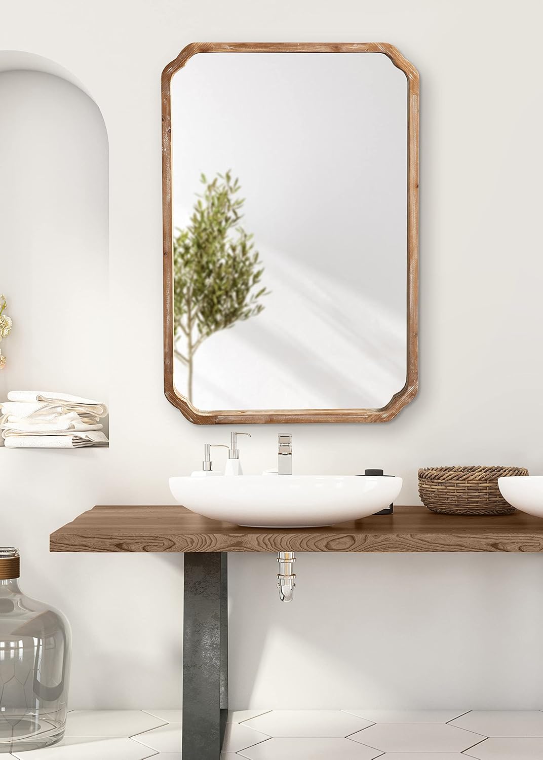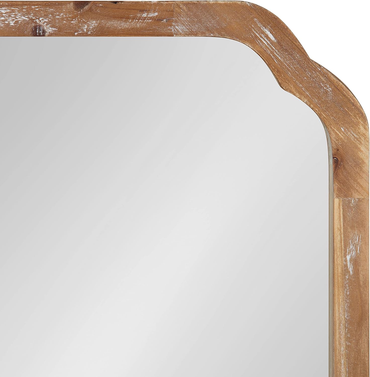 RUSTIC LOOK: The vintage-inspired Marston mirror features a rustic wooden appearance and scalloped corners, creating an antique aesthetic