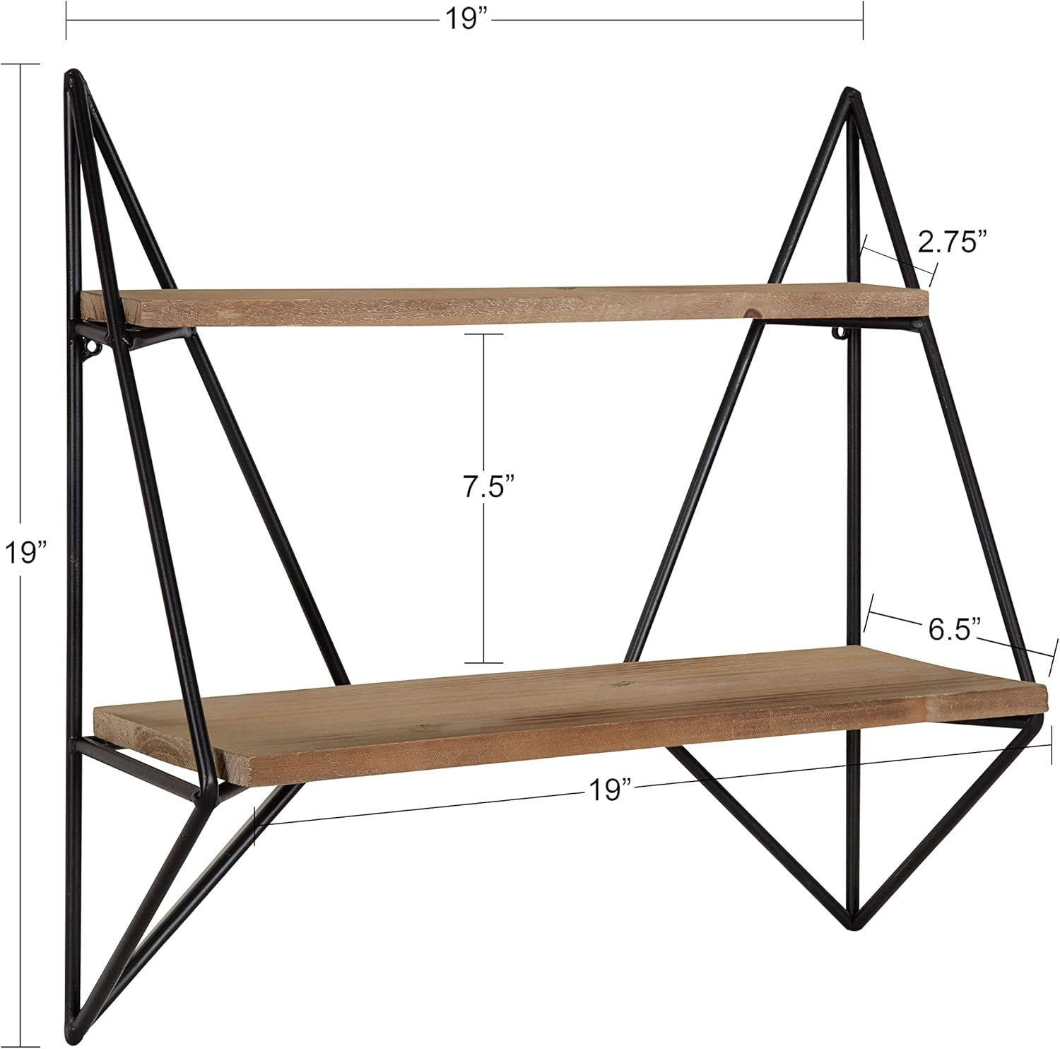 This 2-tiered decorative floating wall shelf oozes sophistication. The overall dimensions are 19-inches tall x 19.5-inches wide. The classic design holds the 2 solid wood shelf boards for a chic, classic look
