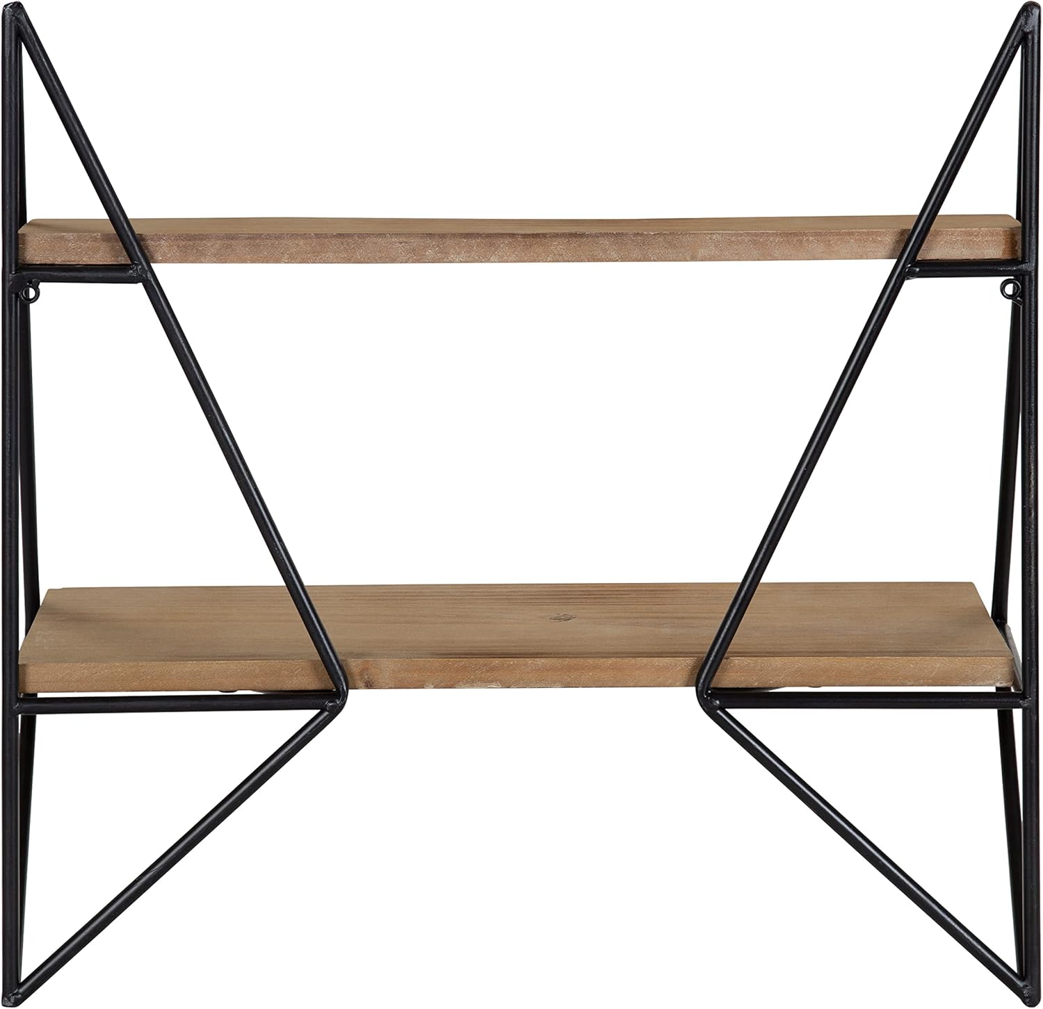The Kate and Laurel Melita 2-Tier Floating Wall Shelf is a small-space friendly shelf with a lovely modern farmhouse casual style. The chic solid wood shelf boards feature a handsome tiered arrangement. The narrow top shelf creates a chic ledge for small item display while the more significant, lower shelf makes for an elegant space for storing books, vases, family pictures, and other trinkets. This gorgeous unit with its striking black metal frame will brighten up any room and showcase your love of design. The overall dimensions are 19.5-inches wide by 19-inches tall and 7-inches deep.