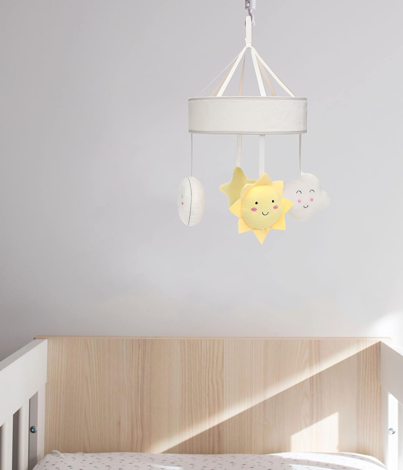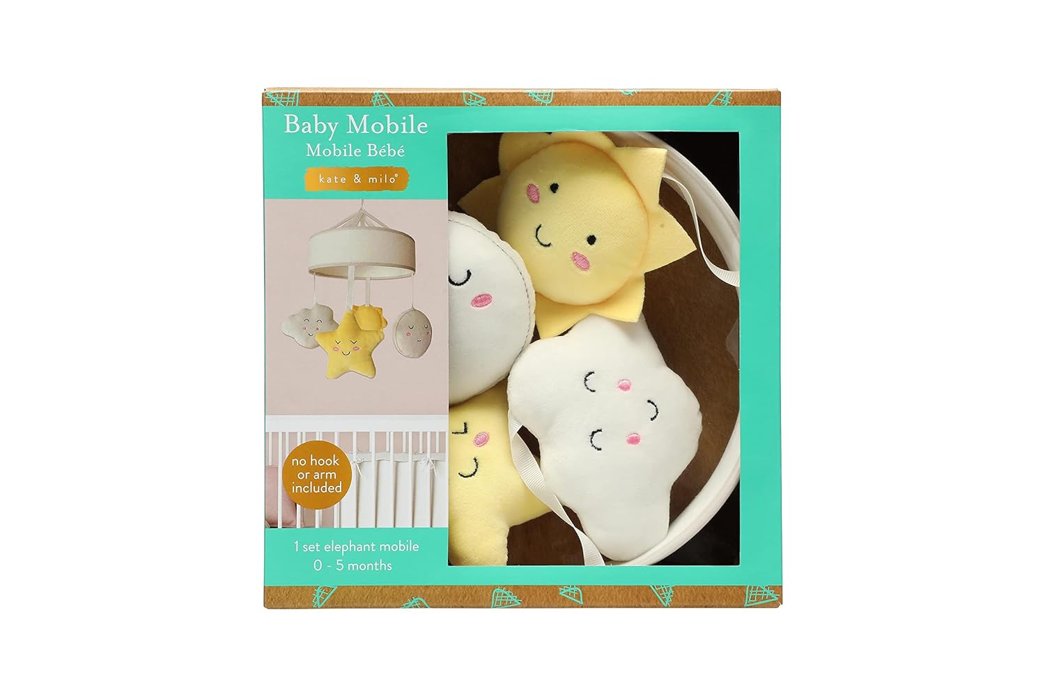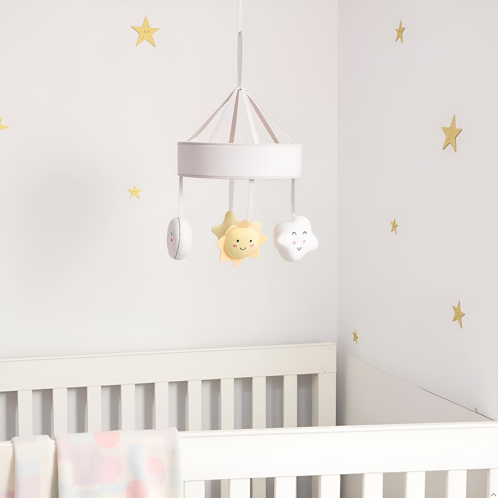 Includes white, gray and yellow mobile with plush sun, star, cloud and moon