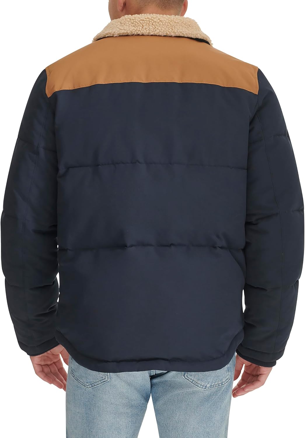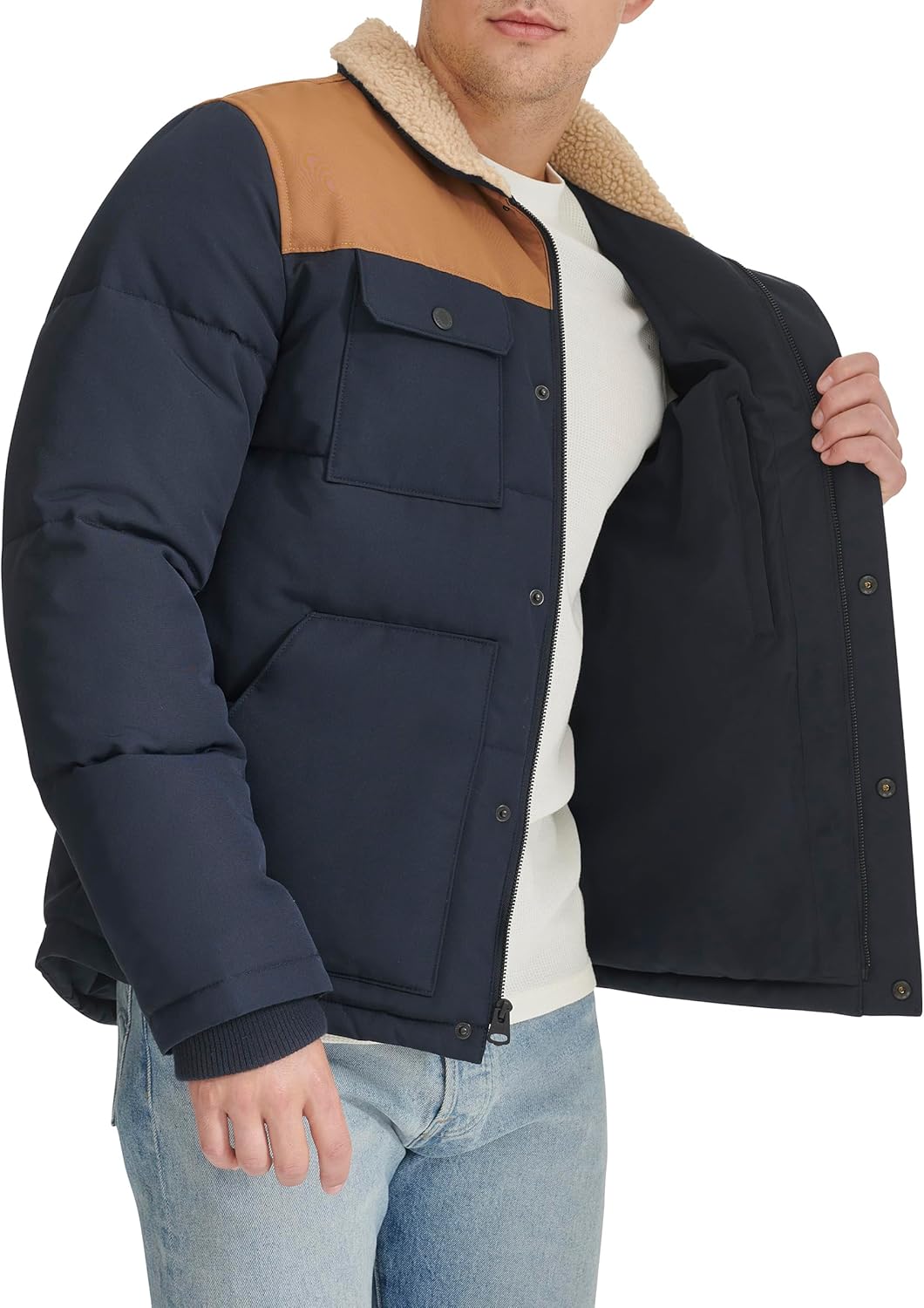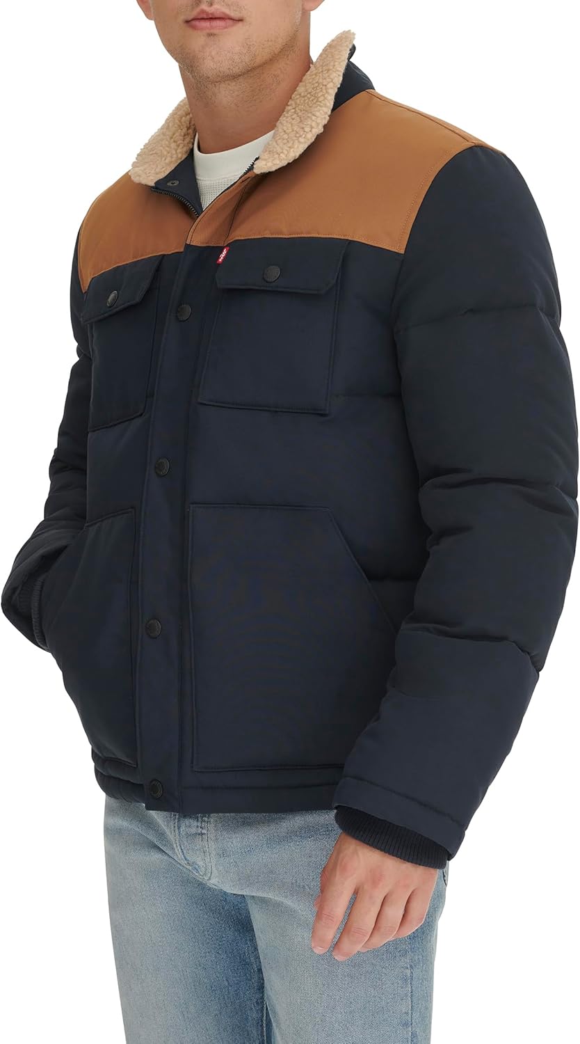 The Levi’s Men’s Woodsman Puffer Jacket combines warmth and rugged style with its puffer trucker silhouette in durable arctic cloth. Featuring a cozy sherpa-trimmed collar, this jacket is designed to keep you comfortable in colder conditions. The dual closure with both a zipper and snaps offers added protection against the elements. A contrast fabric accent yoke design and a shirt-tail back hem enhance the jacket’s unique look, while rib-knit storm cuffs provide extra warmth. With two chest flap pockets, two lower pockets with side entry, and an interior welt pocket with zipper closure, this jacket delivers both style and ample storage. The model is 6’1″ and wears a size medium, giving a helpful fit reference.