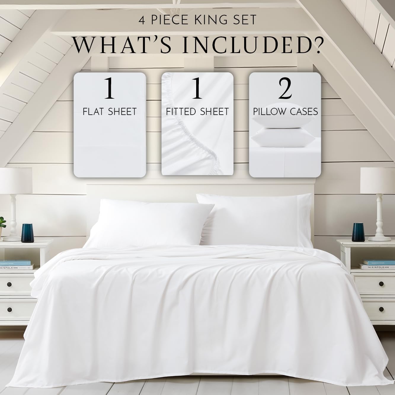 Includes: 1 flat sheet (108” x 102”), 1 fitted sheet (78” x 80”), and 2 king-size pillowcases (40” x 20”)