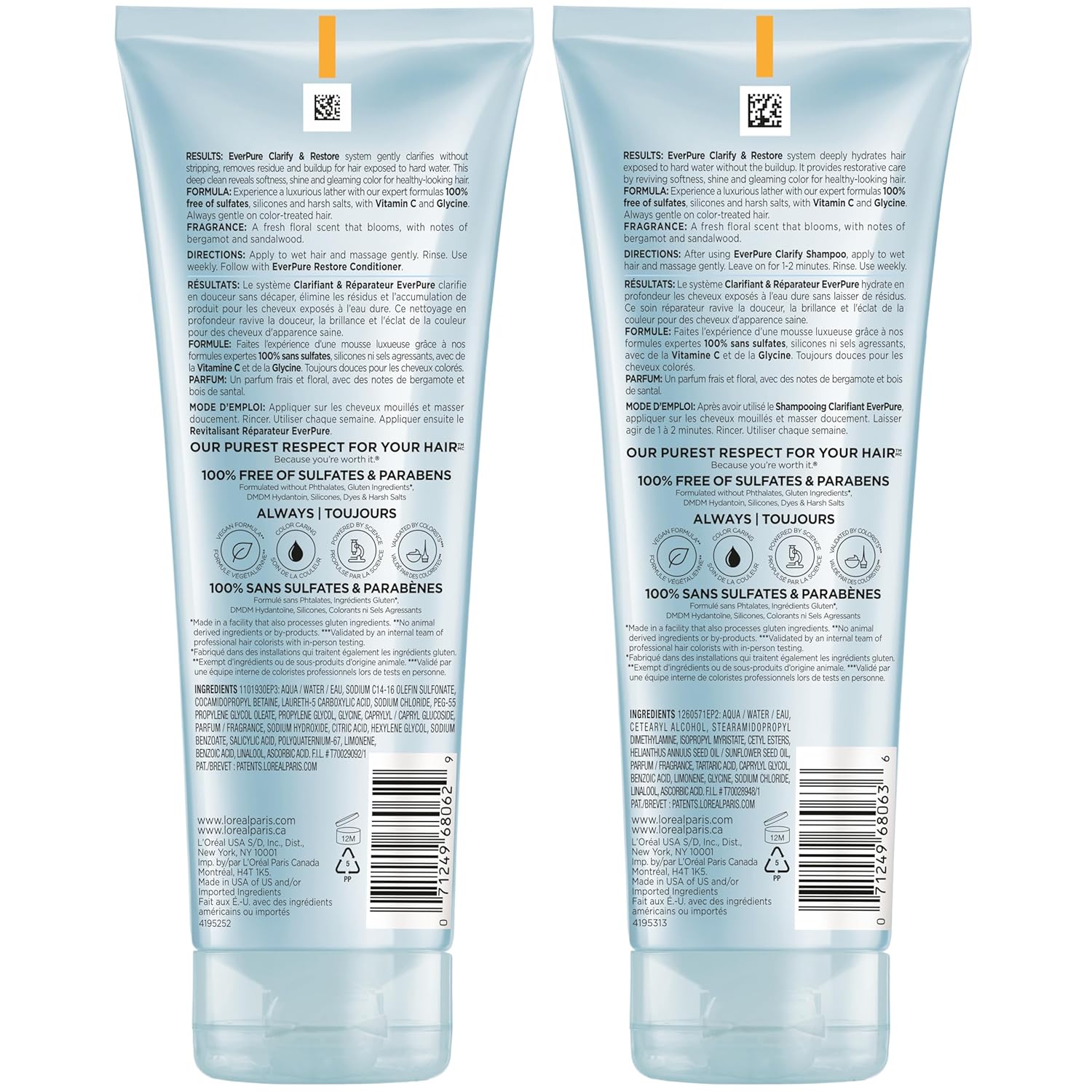 L’Oreal Paris Clarify and Restore Sulfate Free Shampoo and Conditioner Set with Antioxidants for Hard Water Exposure and Styling Build-up, EverPure, 1 Hair Care Kit