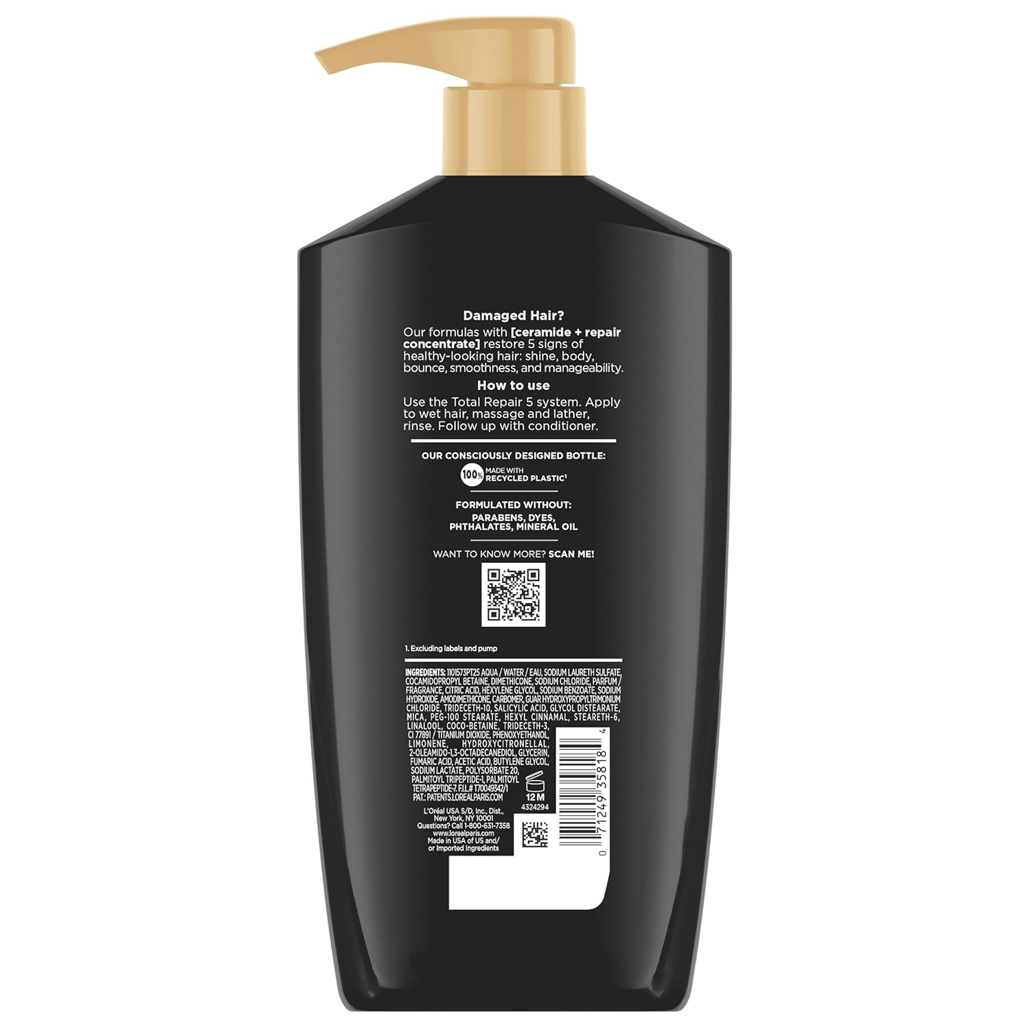 L’Oreal Paris Total Repair 5 shampoo helps repair the five visible signs of damaged hair. The results? 1) Rebuilt fibers 2) Strength 3) Vitality 4) Silkiness and 5) Shine. Our strengthening system with Protein + Ceramide helps fortify each strand, reinforcing hair fiber and sealing-in nourishment. For best results, use L’Oreal Paris Total Repair 5 shampoo and conditioner together.