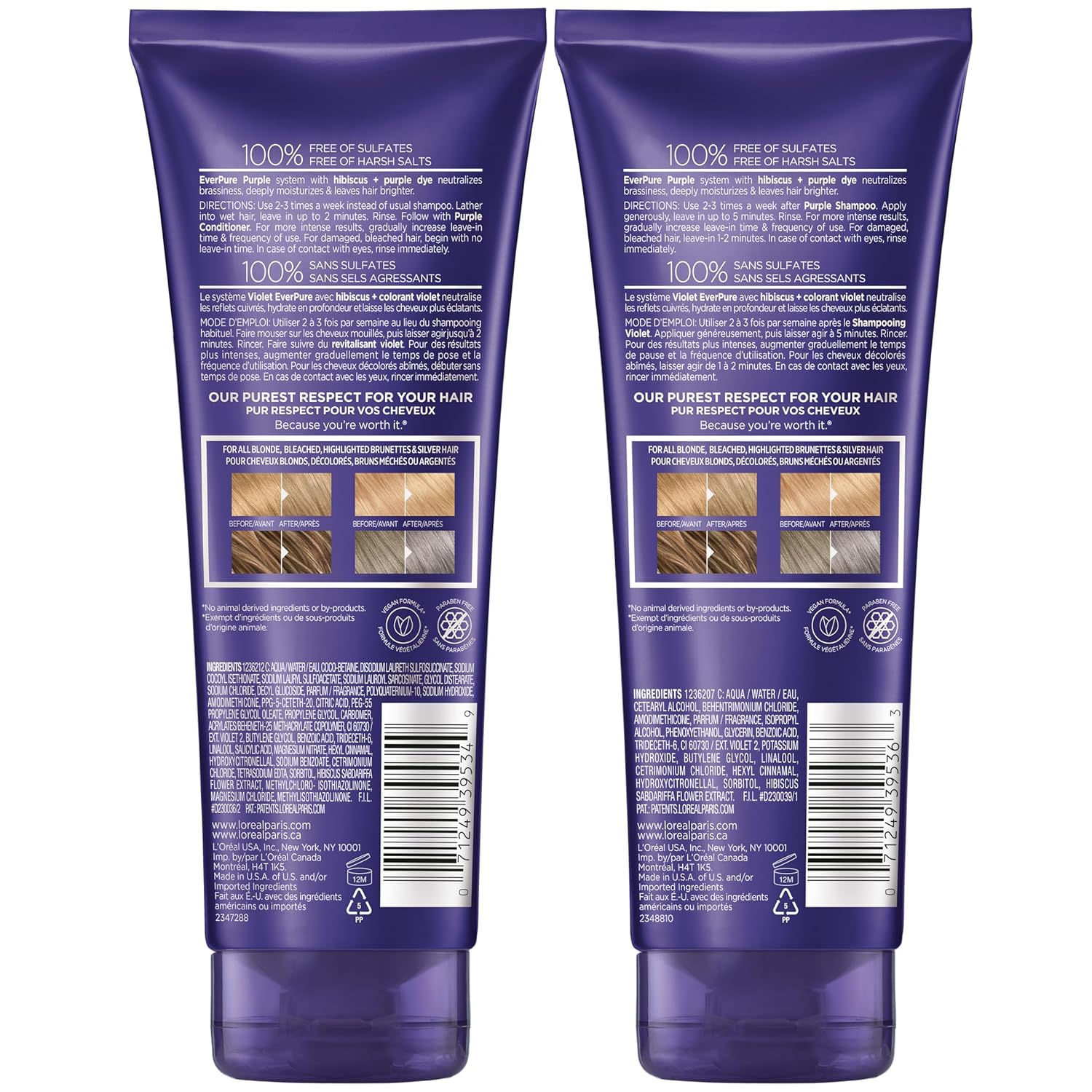 Ever Pure Purple brass toning purple shampoo and conditioner with hibiscus and purple dye neutralizes brassy yellow to orange tones while keeping your hair hydrated. The formula is designed to work on all blonde, bleached, highlighted brunettes and silver hair. 100% Sulfate Free, Paraben Free, No harsh Salts and vegan No Animal derived ingredients or by-products. Formula not tested on animals.