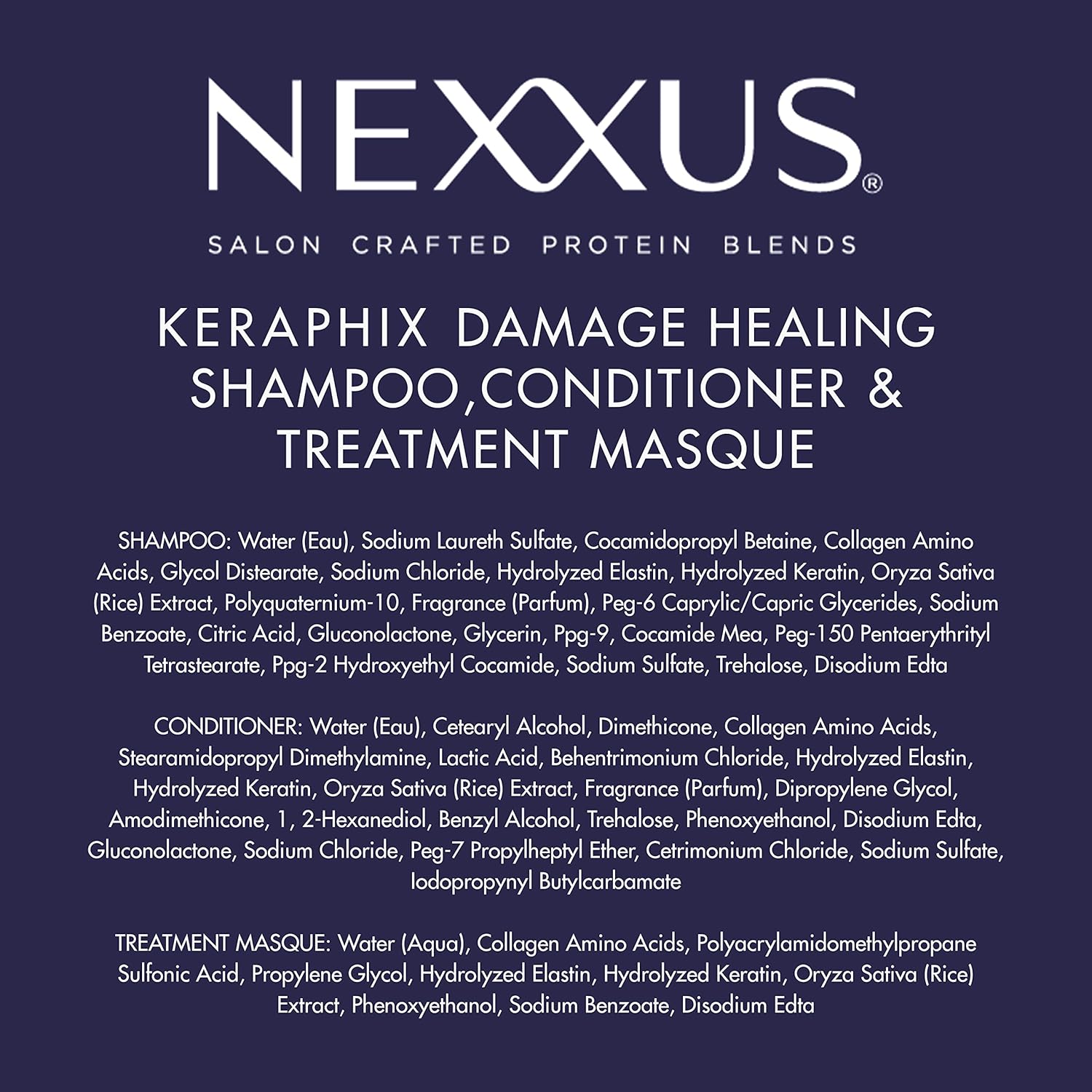 Get the New York City salon experience at home with Nexxus Keraphix Shampoo for Damaged Hair, the first step to a powerful protein-infused keratin treatment that visibly heals signs of severe hair damage after just one use. Clinically proven to deliver internal repair to severely damaged hair from the very first use, Nexxus Keraphix System helps heal rough and brittle hair. The concentrated formula of this hair treatment for damaged hair features our highest level of proteins containing Keratin, Collagen, and Elastin. Nexxus combines black rice with Keratin Protein and other essential nutrients to create clinically proven healthy-looking hair. Salon-crafted with our exclusive PROTEINFUSION blend, it’s part of a unique 4-step process. When complete, signs of surface damage are healed, and hair is smooth, strong and healthy-looking. It’s safe and formulated for color and chemically treated hair. At Nexxus, we believe helping hair return to its optimal state means treating it with protein at high levels. Nexxus scientists set out to find inspiration from precious ingredients that could help seal severely damaged hair. The Nexxus Keraphix Shampoo and Conditioner and 3 Hair Treatment Masks, Damaged Hair Repair Treatment, Hair Repair Treatment System Damaged Hair Treatment Healing System for Severely Damaged Hair heals visible signs of severe hair damage. Along with Nexxus keratin shampoo, try our deep conditioner for damaged hair, and evitalizing hair masks, which now all come in this above multi-pack. We’ve created possibly our best hair mask: Keraphix Hair Masque for Damaged Hair our favorite deep conditioning hair treatment. A leader in salon-quality hair products, Nexxus uses learnings from science and nature. We know that hair is made of almost 90% proteins, which is why we use advanced scientific methods to identify the protein needs of each hair type and create customized formulas with proteins to bring your hair back to life.