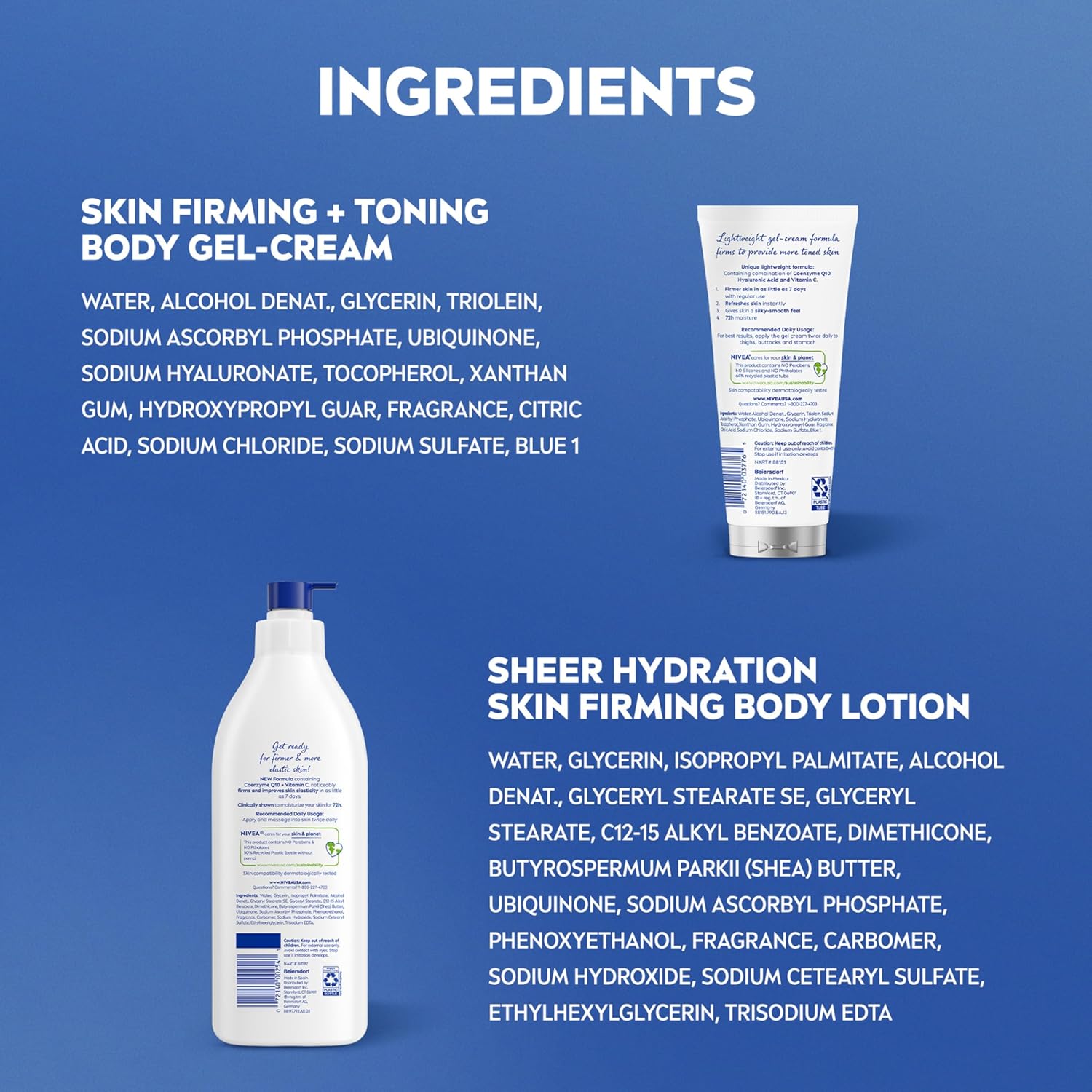 SKIN CARE SET INCLUDES: One 16.9 fluid ounce pump bottle of NIVEA Sheer Hydration Skin Firming Body Lotion and one 6.7 ounce tube of NIVEA Skin Firming & Toning Body Gel Cream
