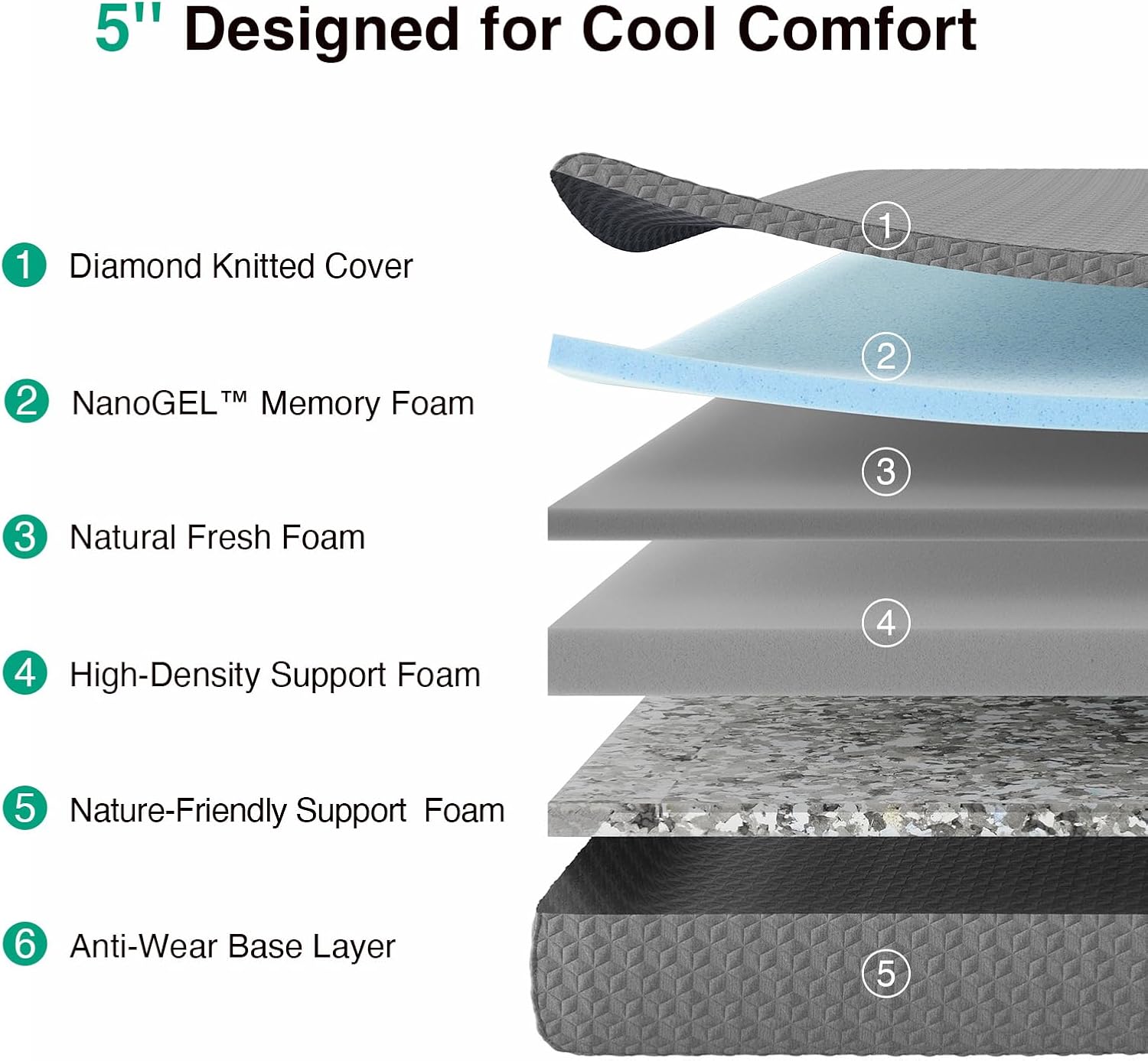 Cooling Gel Layer for Nighttime Comfort – Designed to deliver a refreshing night’s sleep, this 5 inch full mattress combines gel-infused memory foam with ultra-soft fabric for a cool, cloud-like feel. It gently adapts to body curves while regulating temperature. The memory foam mattress full fits all standard bed frames, and hypoallergenic materials offer added peace of mind for sensitive skin
