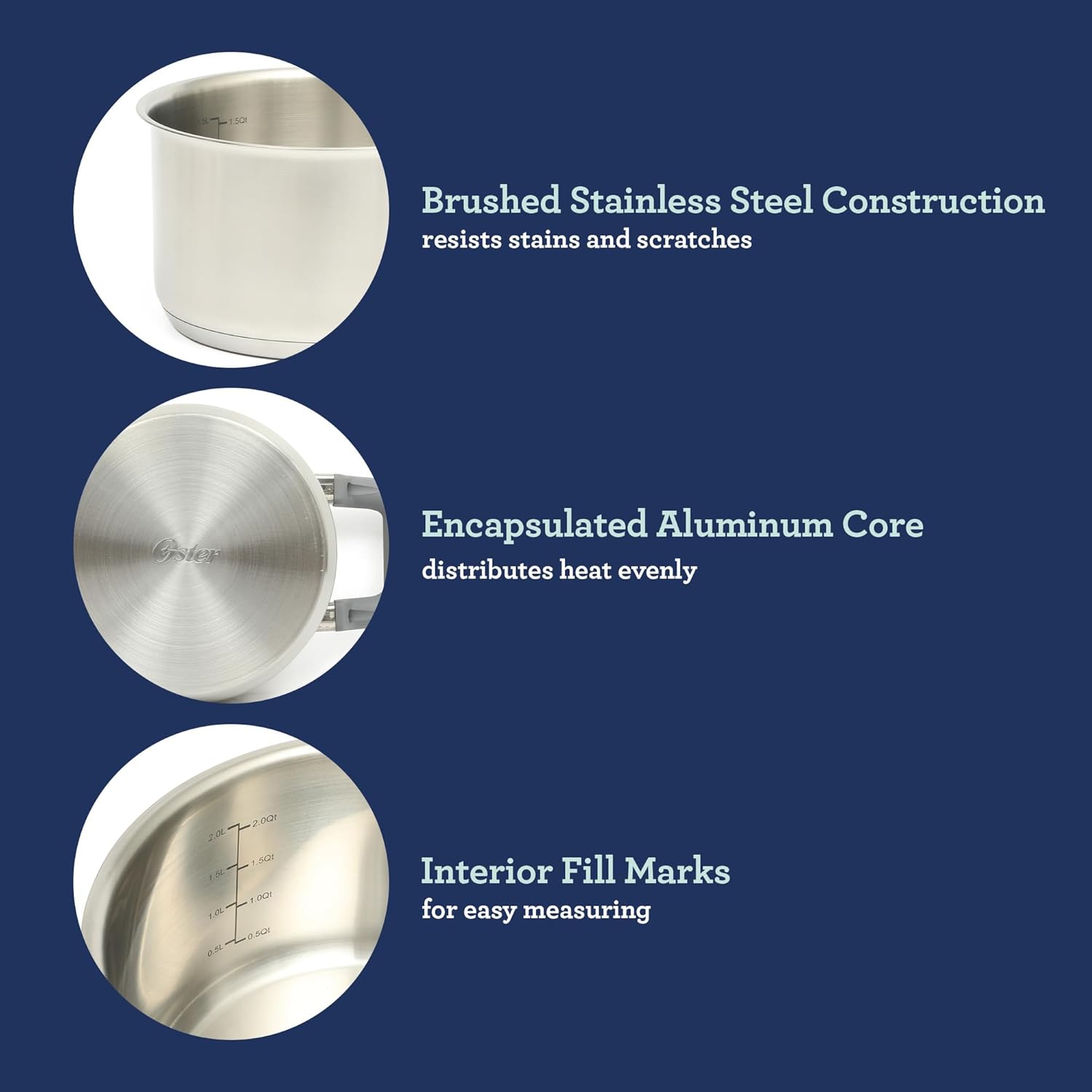 GET CREATIVE IN THE KITCHEN: From the basic techniques to the more elaborate recipes, Oster pots and pans meet the needs of home cooks to encourage creativity in the kitchen. Stainless steel construction is what every home chef’s cookware dreams are made of. Whether a home chef needs to cook up a storm or put together a quick meal with 5 ingredients or less, stainless steel cookware has the versatility and durability to deliver delicious results.