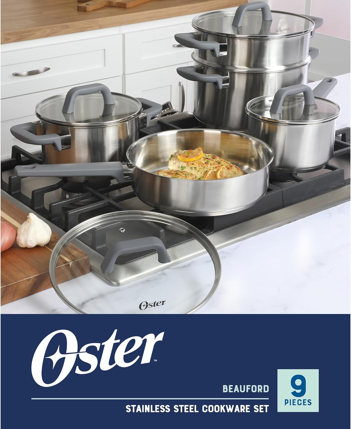 Whether a home chef needs to cook up a storm or put together a quick meal with 5 ingredients or less, the Oster™ Beauford Stainless Steel Cookware Set has the versatility and durability to deliver delicious results. These stainless steel pots and pans conduct heat and cook evenly – thanks to the encapsulated aluminum core – to serve the best and finestr flavors and texture every time. Plus, these pieces are easy to clean due to the brushed exterior finish that resists stains and scratches. Meanwhile, the non-reactive interior does not cause chemical reactions with food, making this cookware set the best kitchen equipment to make tomato- or citrus-based recipes. The soft-touch handles give a safe and comfortable grip, while the rivetless design means easier cleanup after every use. Not only does it offer a seamless look, but it also ensures that no stubborn residues or grime gets stuck in between the corners of each rivet head. The set also comes with flat, tempered glass lids that fit snugly to lock in heat and moisture while letting home cooks easily peek at simmering soups and stewing meat and potatoes. Best of all, the lids are shatter-resistant, and the whole set is dishwasher safe—so cleanup’s a snap.