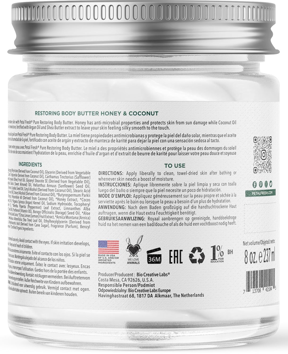 Petal Fresh Pure, Restoring Body Butter, Heals, Repairs & Protects Skin with Honey & Coconut Oil, 8 Fl oz
