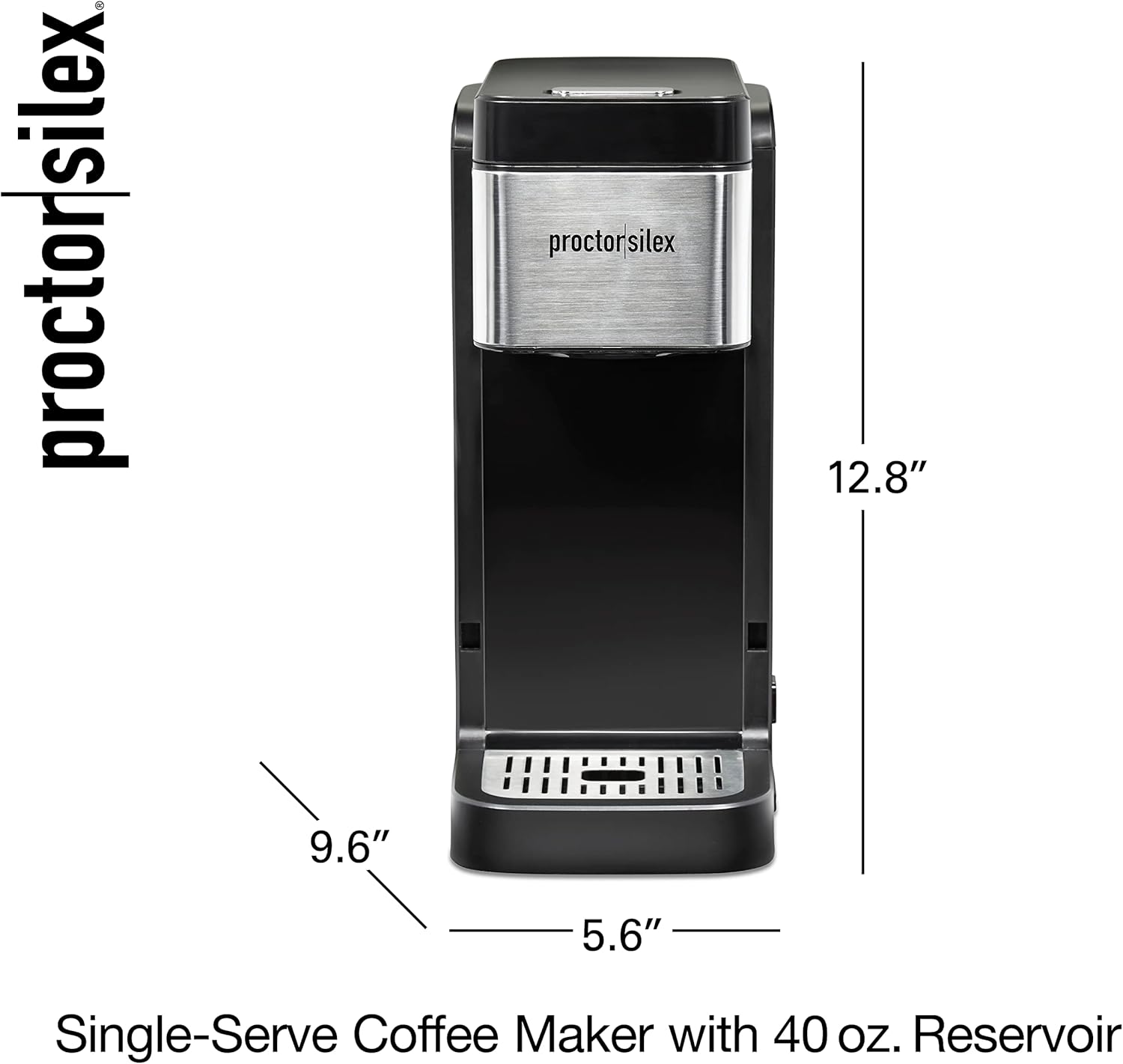 The Proctor Silex Single-Serve Coffee Maker with 40 oz. Reservoir holds enough water to make four 10 oz. brews without refilling. Easily brew piping hot coffee with your favorite ground coffee or pod. Durable and backed by a 3 year limited.