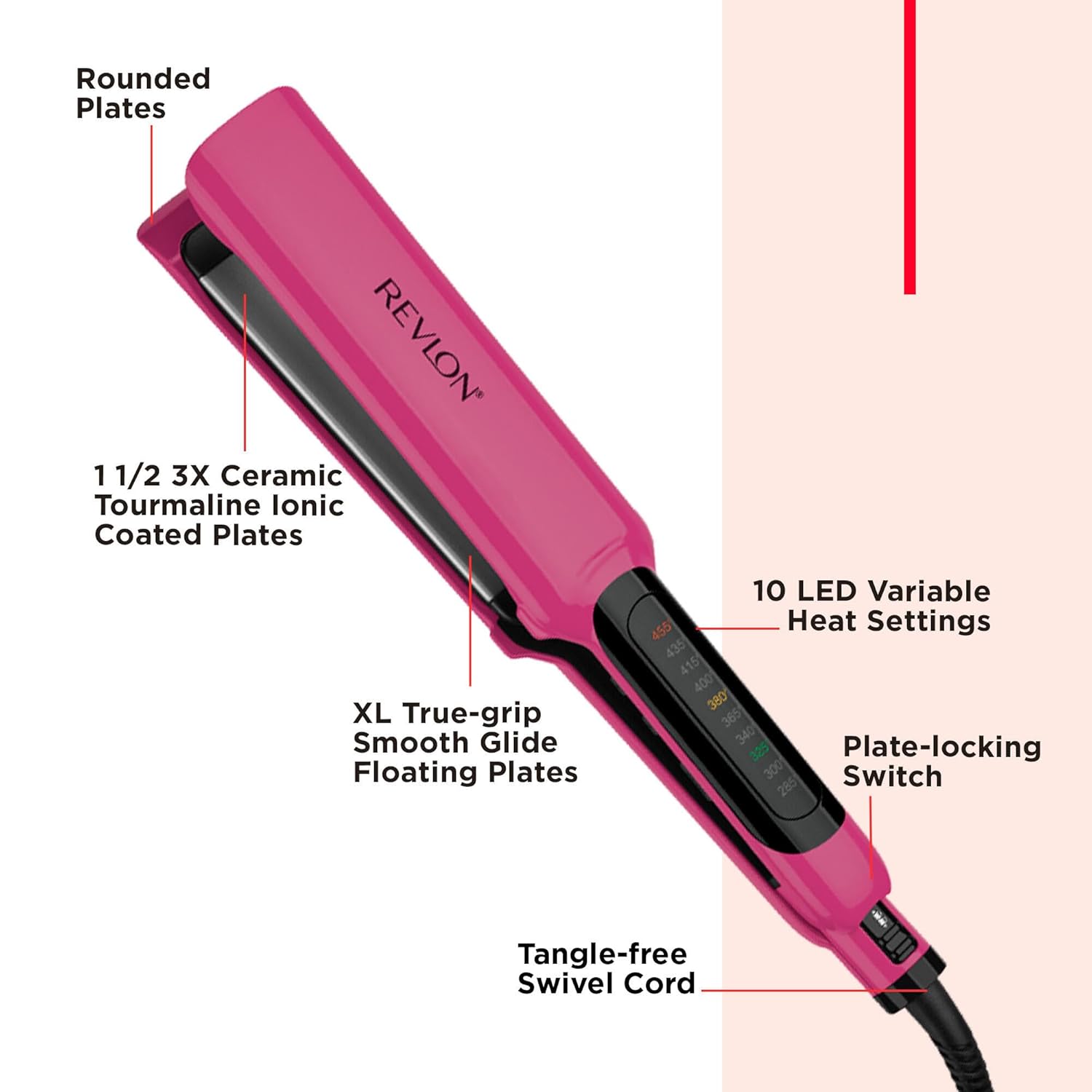 The Revlon Perfect Straight Smooth Brilliance 1 1/2″ XL flat iron quickly and gently smooths even the longest, thickest hair for 4X straighter smooth and shiny results. Featuring extra-long, extra-wide plates with advanced Ionic Tourmaline and a 3X Ceramic styling surface for brilliant shine, less damage, and 2X less frizz. Truly the best in its class, this Revlon straightener is enhanced with True-Grip Technology for an effortless glide while the rounded plate design creates sleek styles or loose waves. Ten LED variable professional high heat settings up to 455 Degree F are fully customizable to provide precise control for all hair types. Other professional features include a plate-locking switch for convenient storage, a separate on/off switch and auto shut-off for peace of mind.
